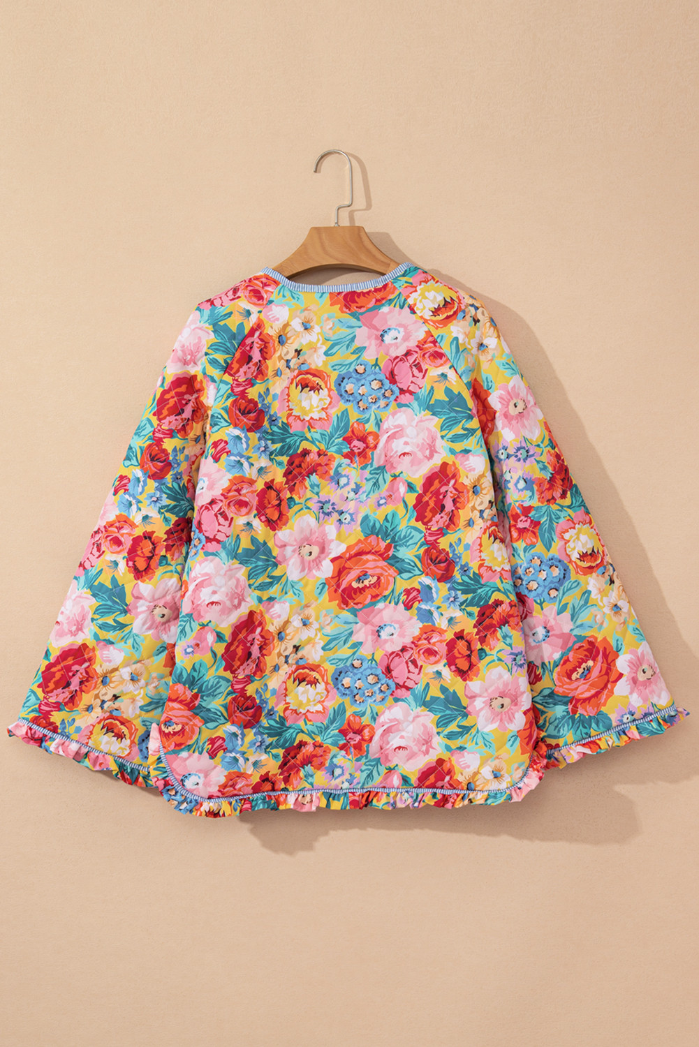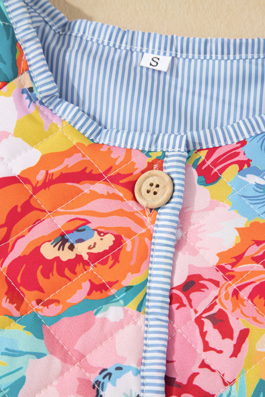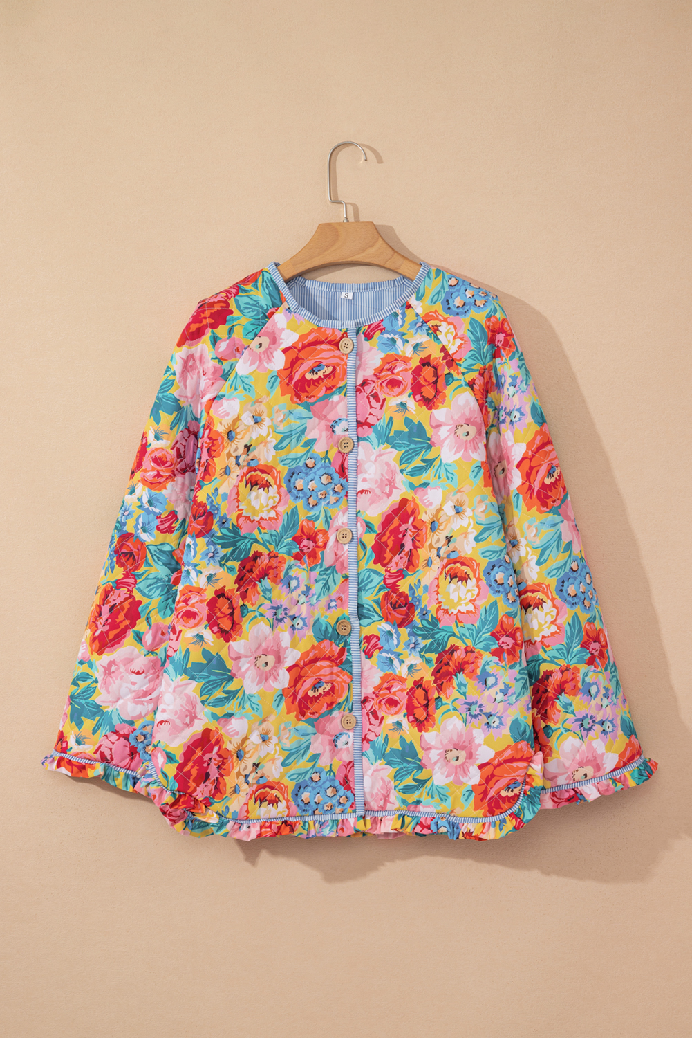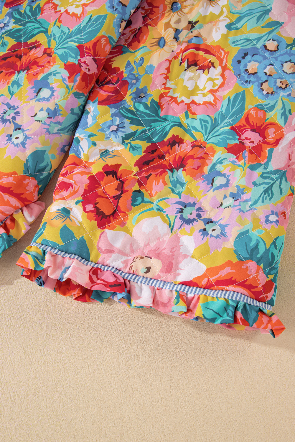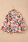 Red Floral Quilted Striped Trim Button Up Puffer Jackets