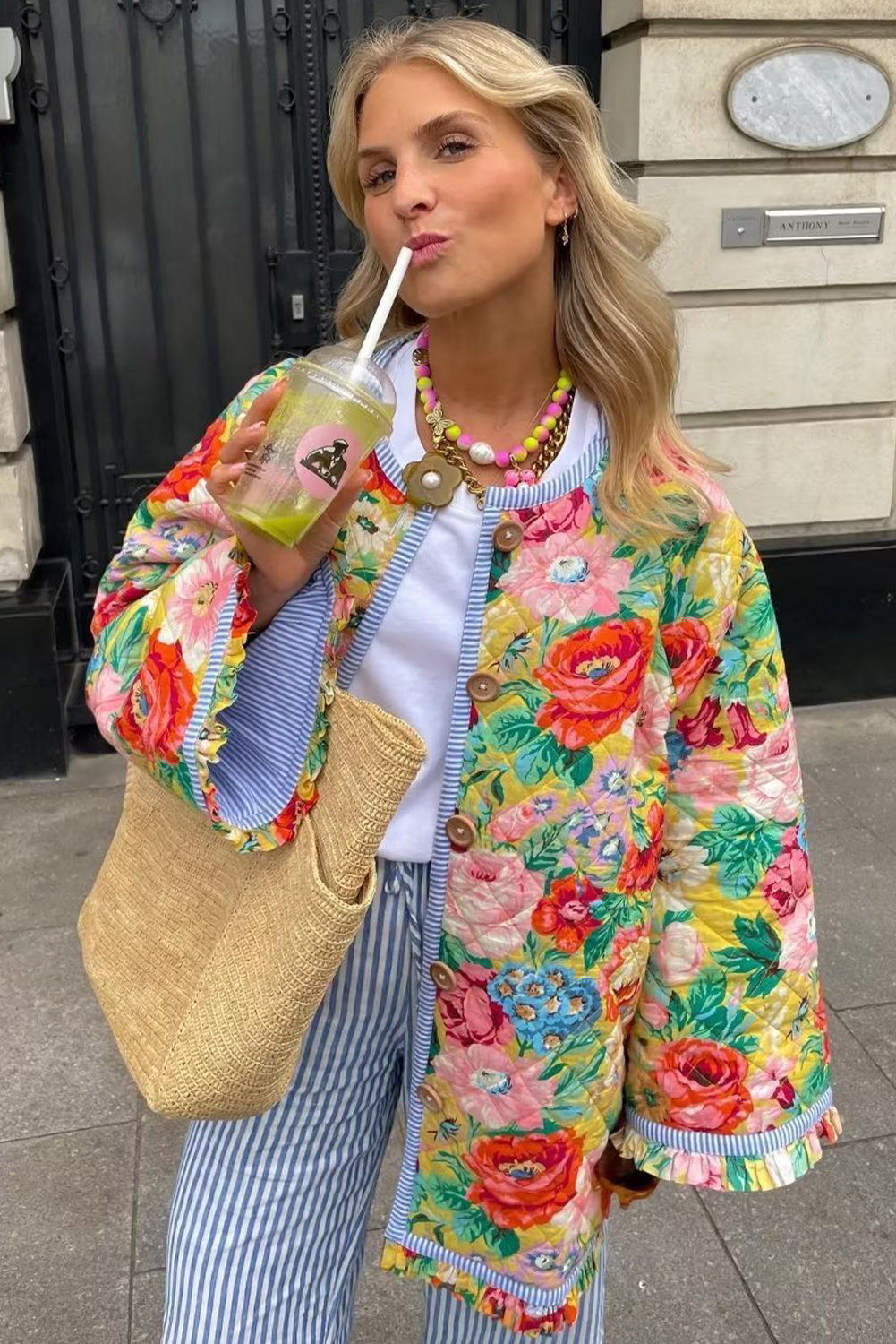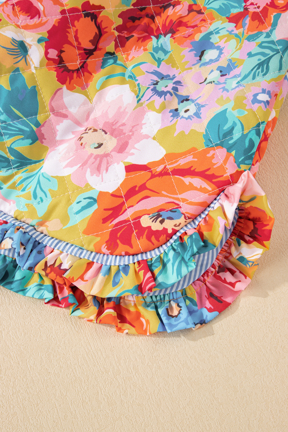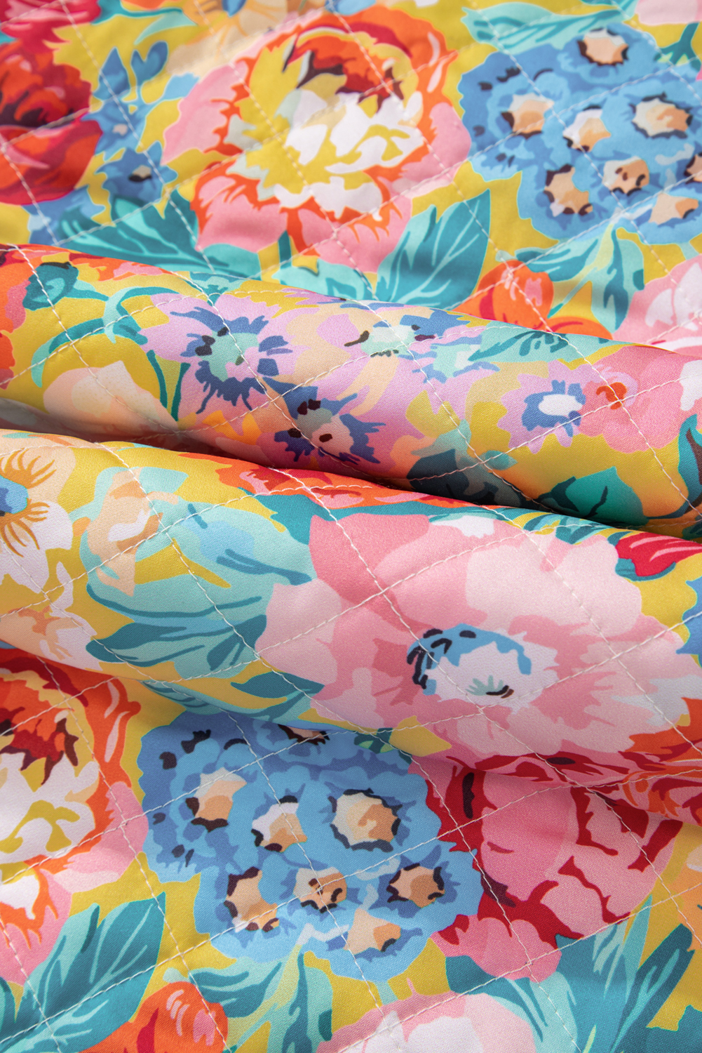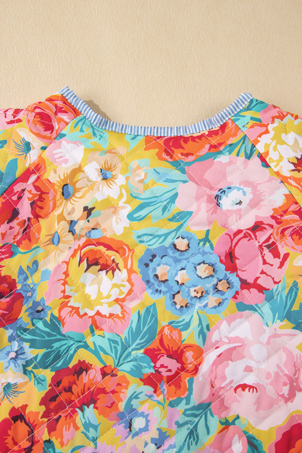 Red Floral Quilted Striped Trim Button Up Puffer Jackets