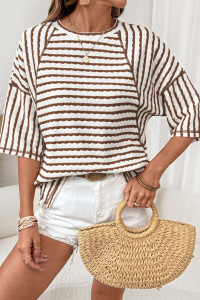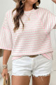 Apricot Stripe Textured Knit Split Hem Half Sleeve Loose Top