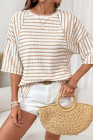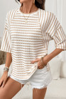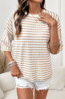 Apricot Stripe Textured Knit Split Hem Half Sleeve Loose Top