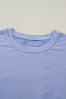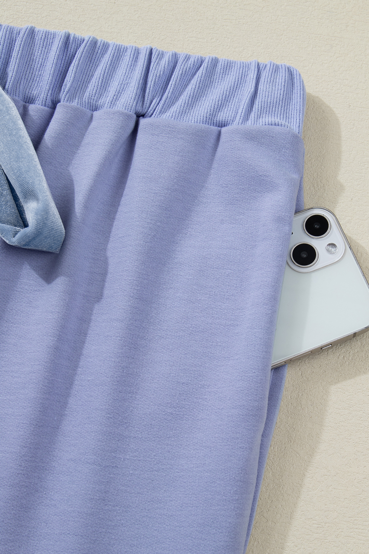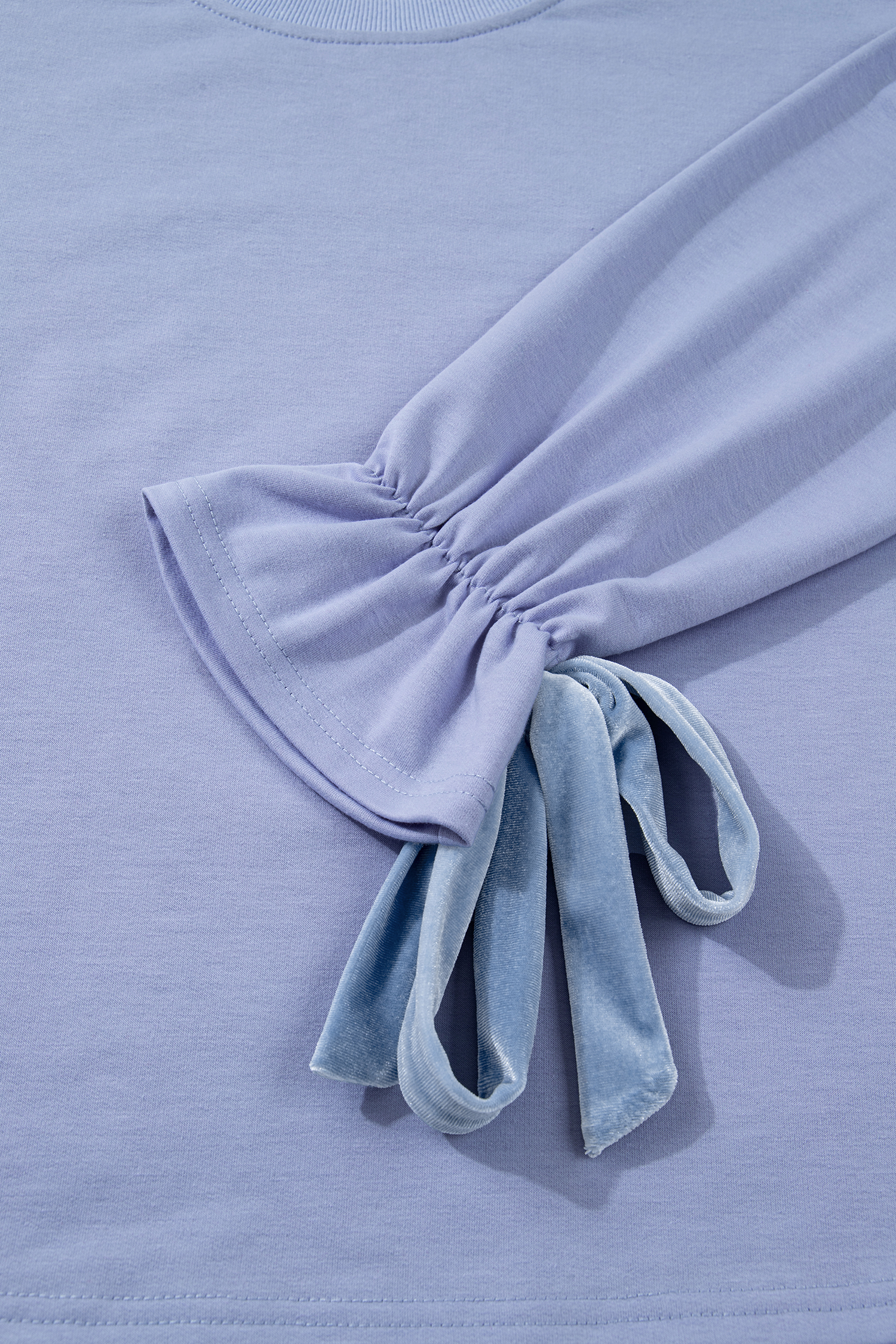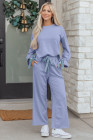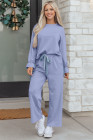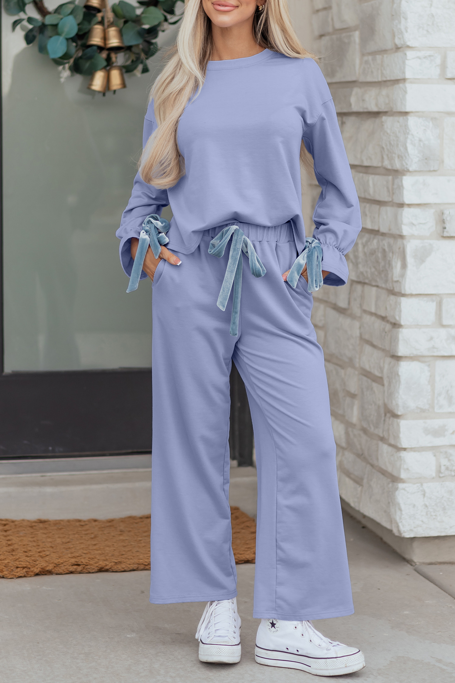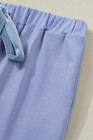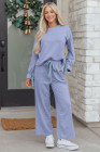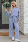 Beau Blue Flounce Long Sleeve Top Drawstring Pants Contrast Velvet Bow Knot 2pcs Lounge Set