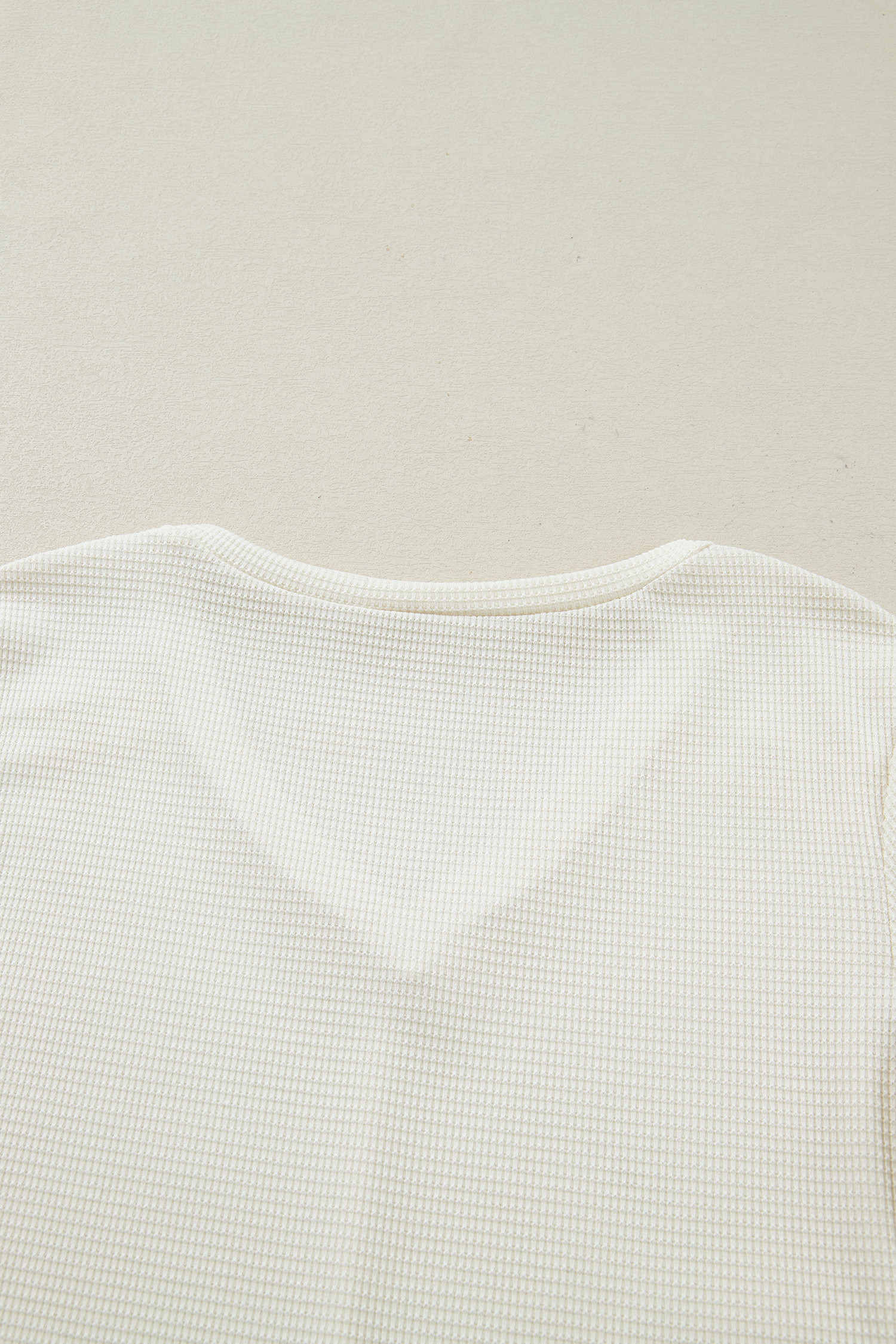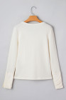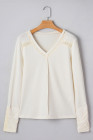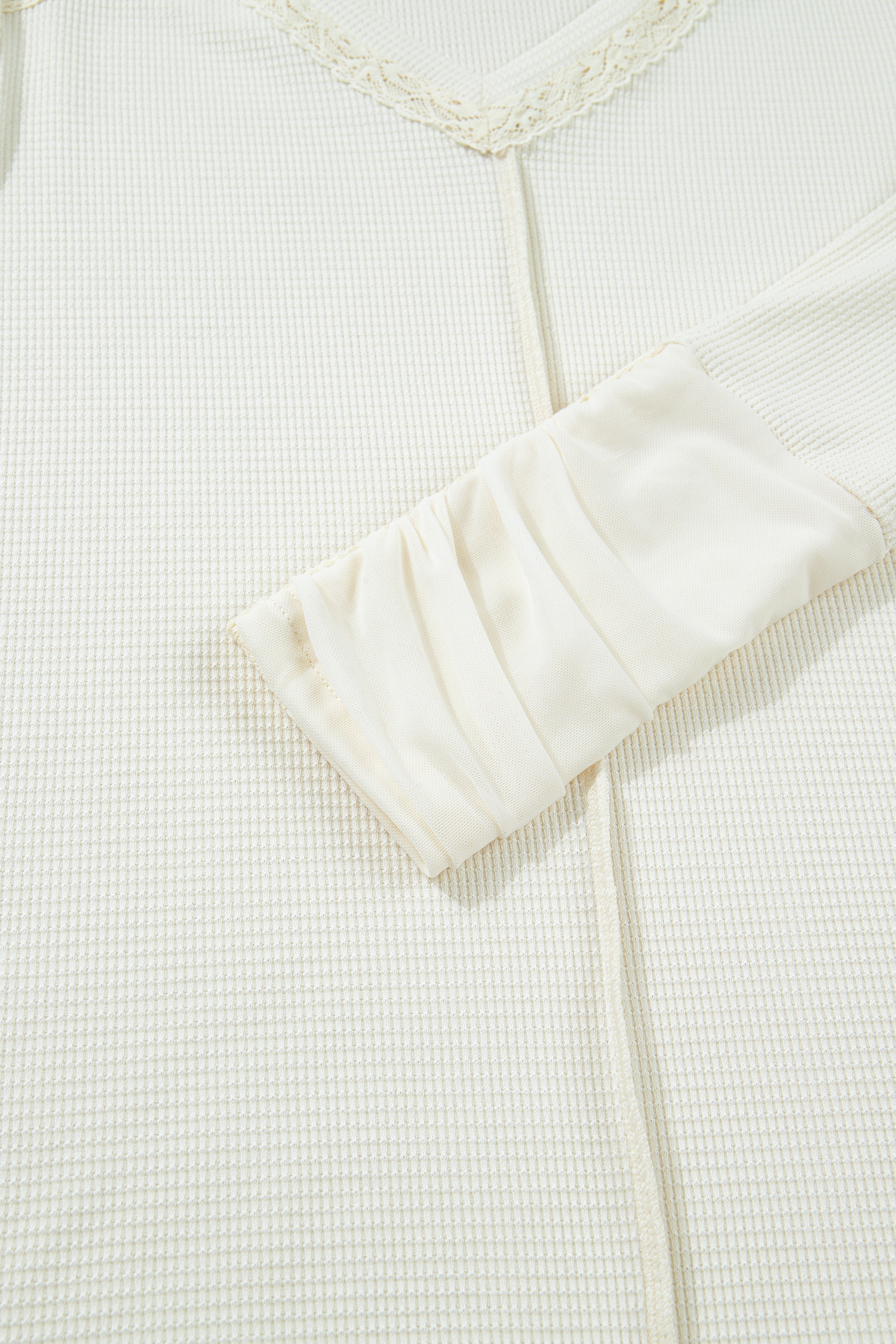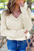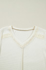 Beige Thermal Knit Lace Ruched Patchwork Long Sleeve V Neck Top