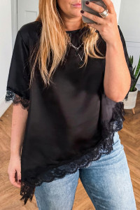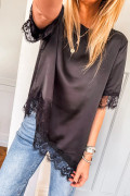 Black Asymmetric Lace Trim Short Sleeve Satin Top