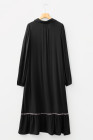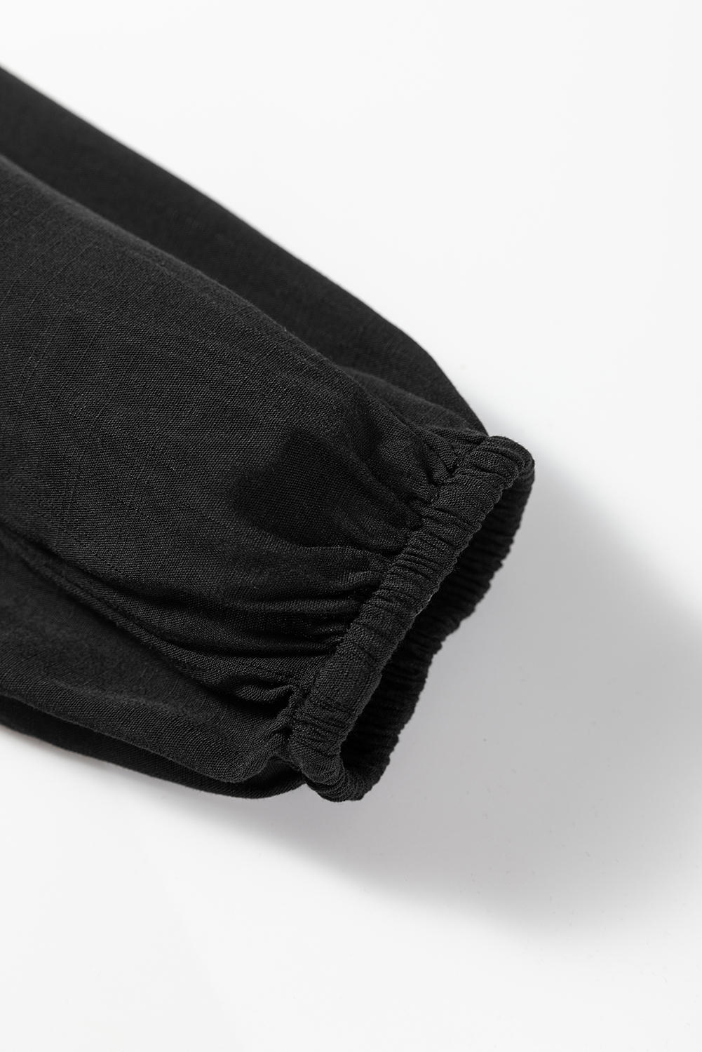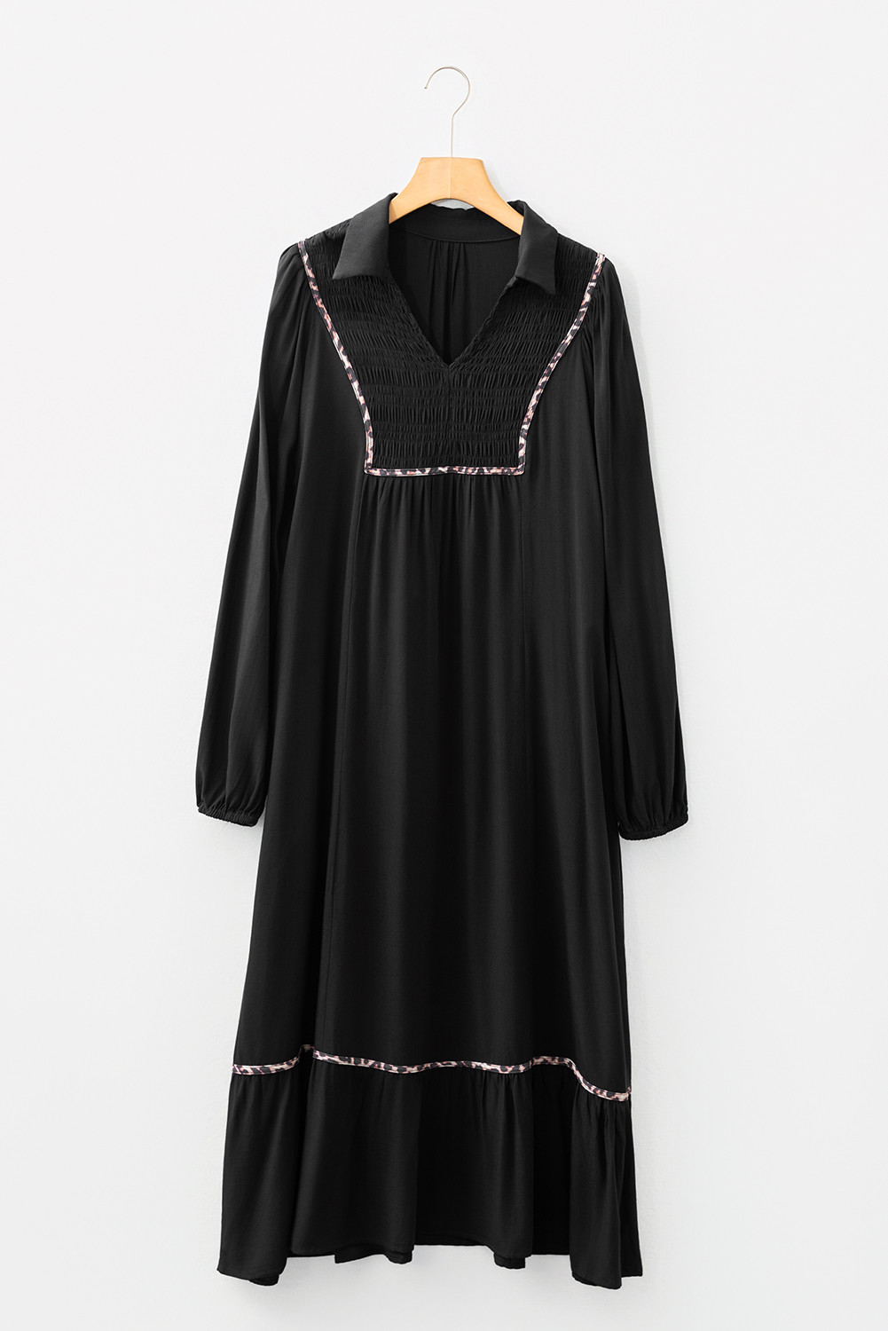 Black Collared V Neck Smocked Detail Contrast Leopard Trim Bracelet Sleeve Long Dress