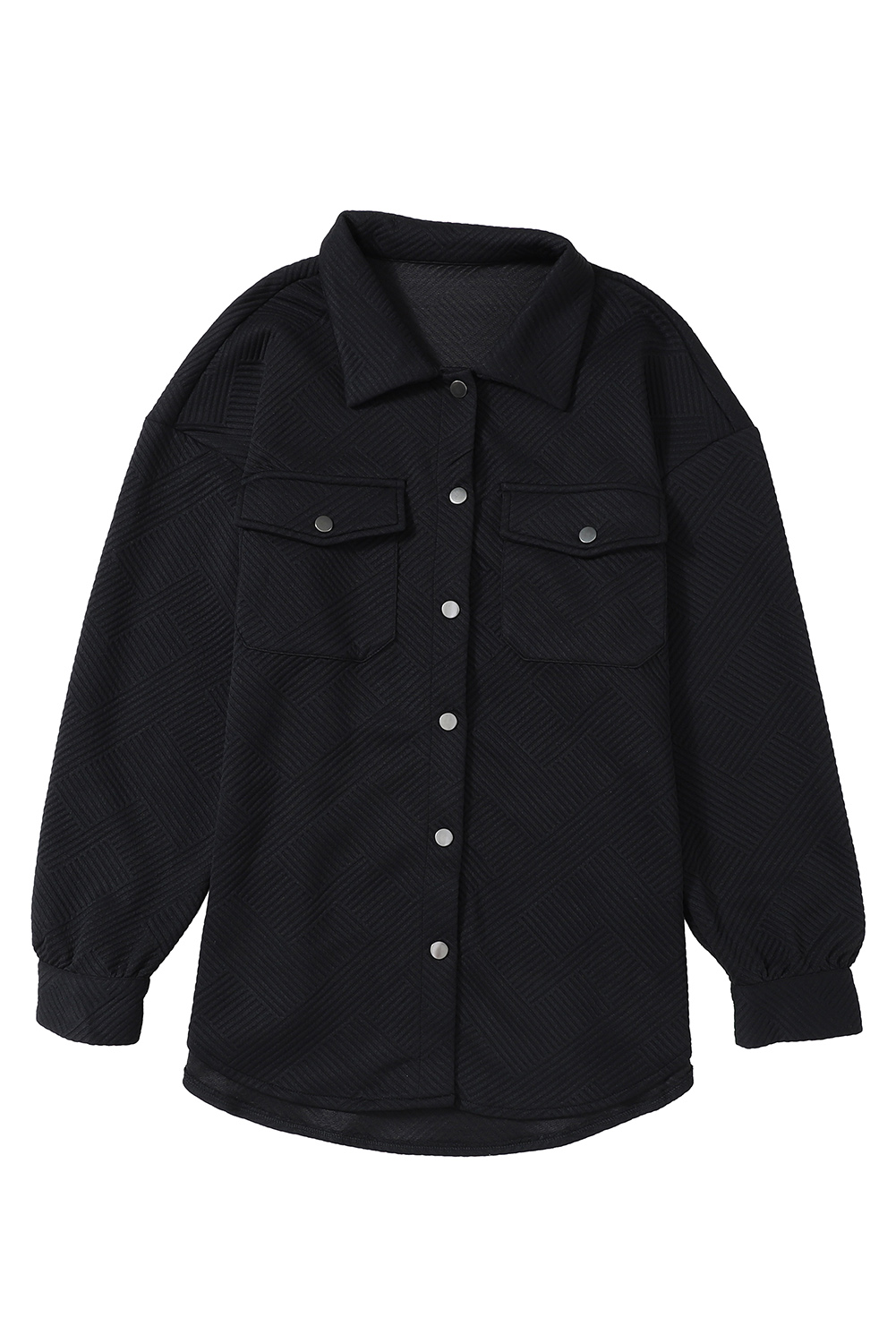 The black solid textured flap pocket buttoned shacket is a must-have for any wardrobe.