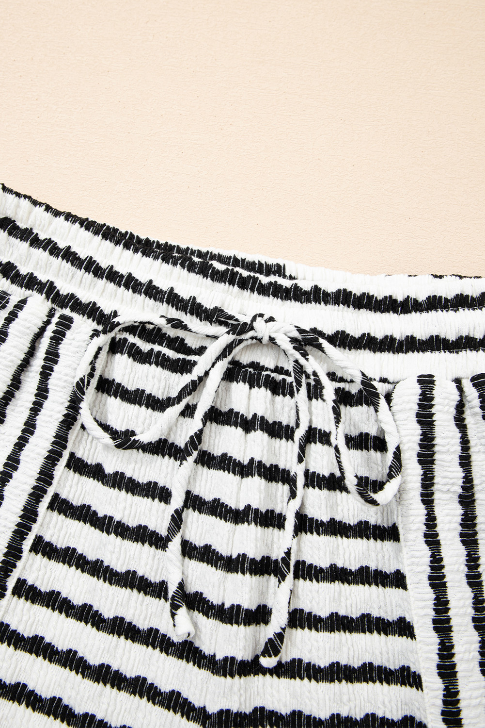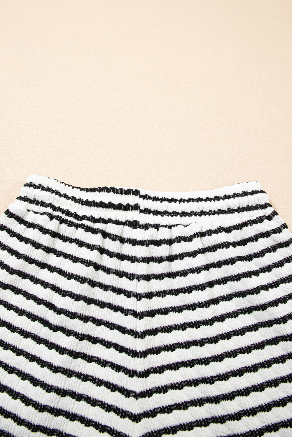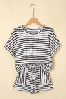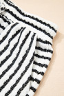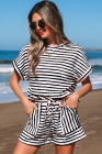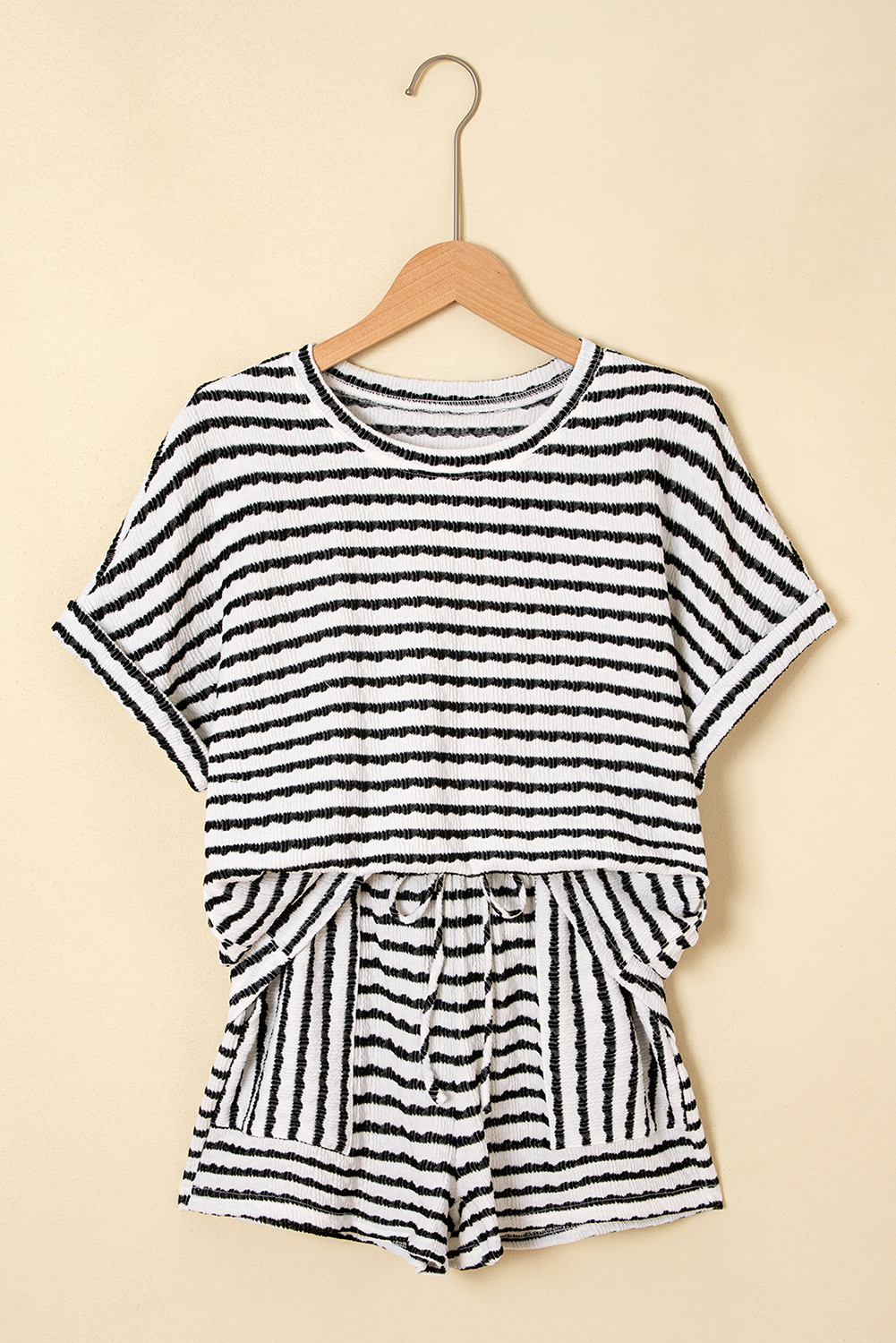 Black Stripe Knitted Short Sleeve Top and Drawstring Shorts Set