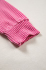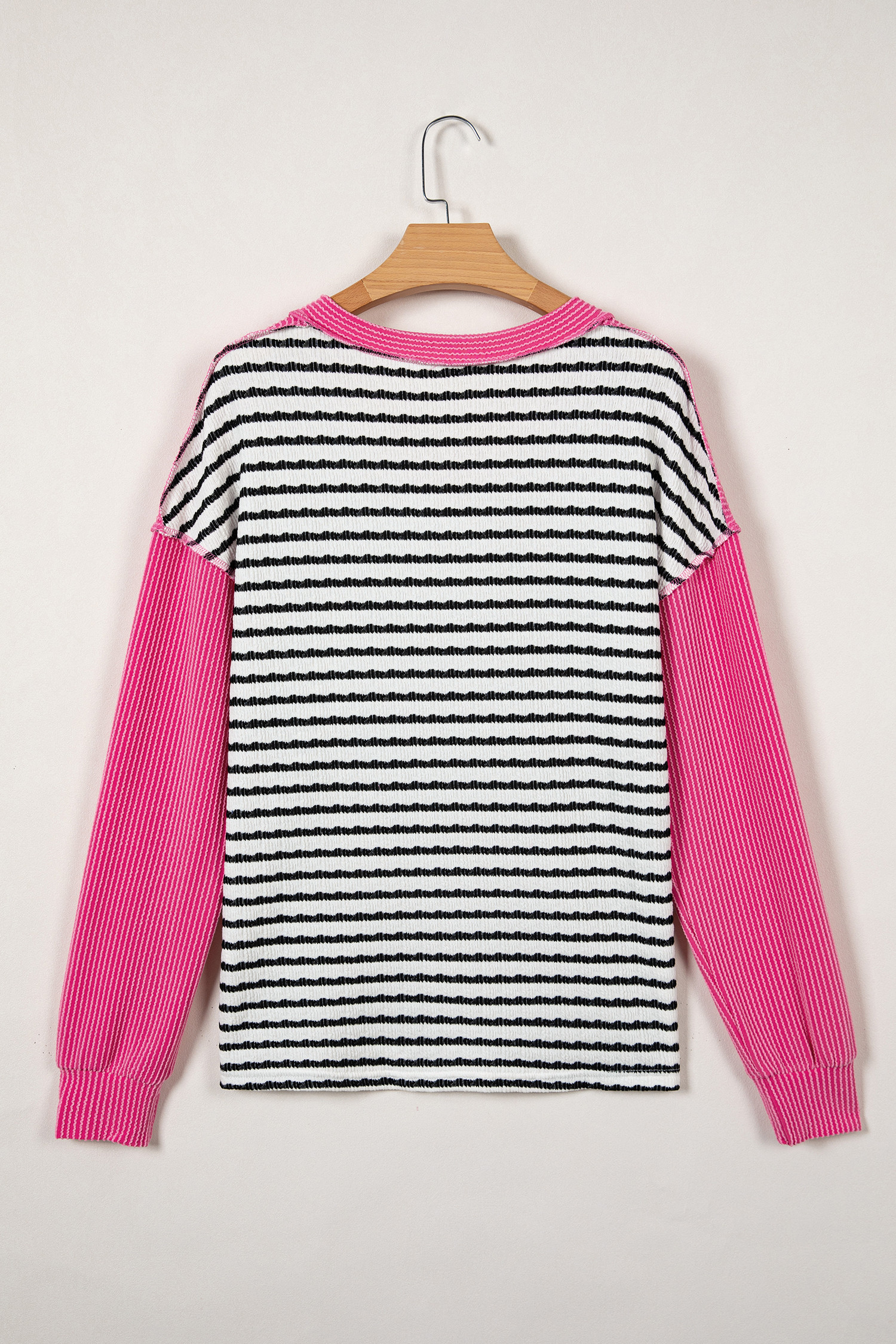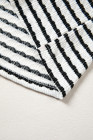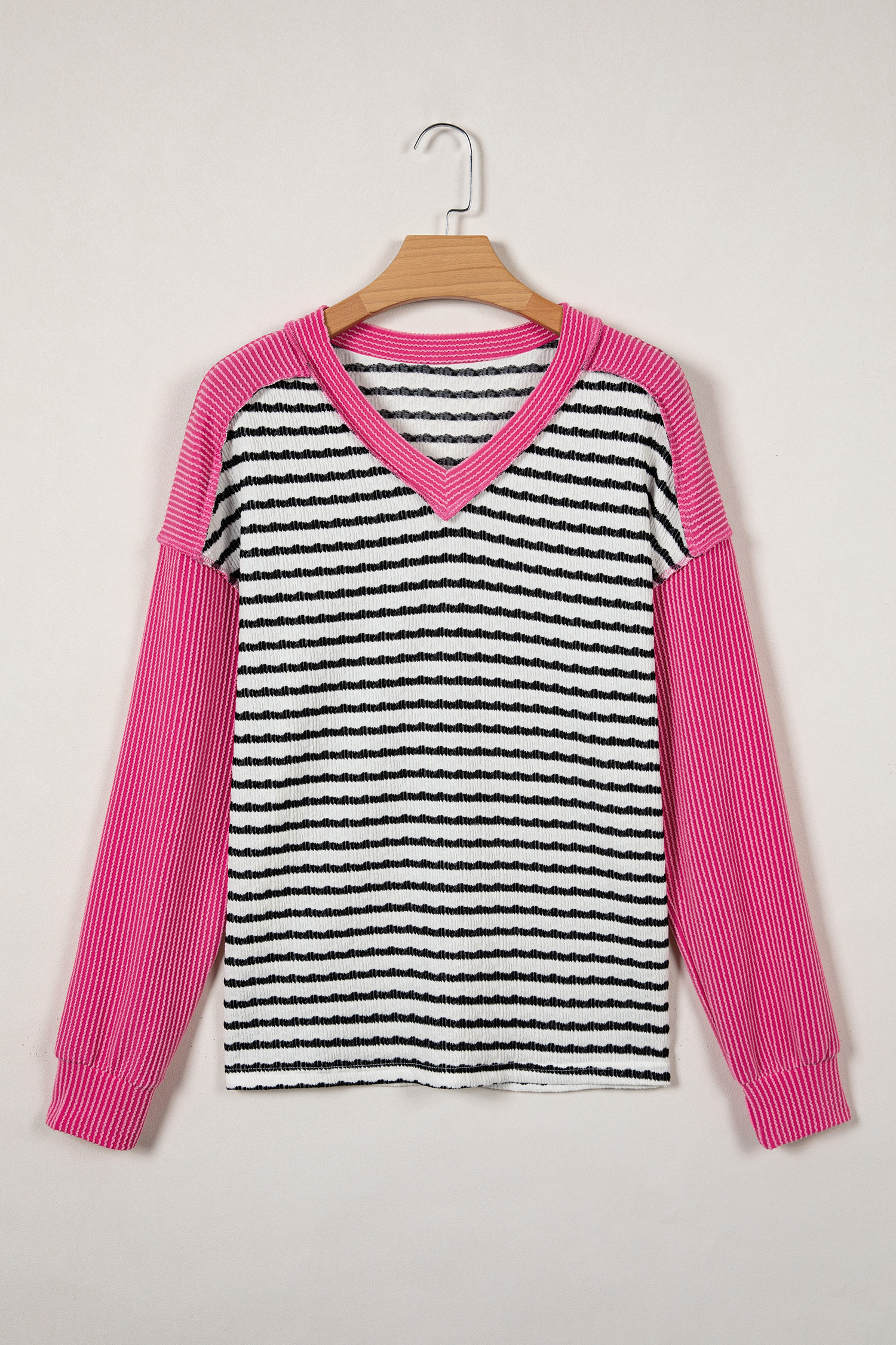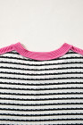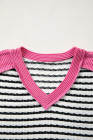 Black Stripe Textured Knit Twisted Rib Contrast Patchwork V Neck Long Sleeve Top