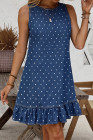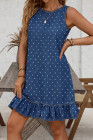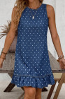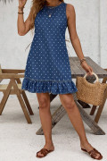 Blue Polka Dot Print Button Detail Sleeveless Ruffle Hem Denim Mini Dress