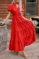Bright Green Solid Color V Neck Short Puff Sleeve High Waist Tiered Maxi Dress