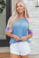 Bright Pink Plus Size Twisted Rib Color Block Patchwork Short Sleeve Henley Top