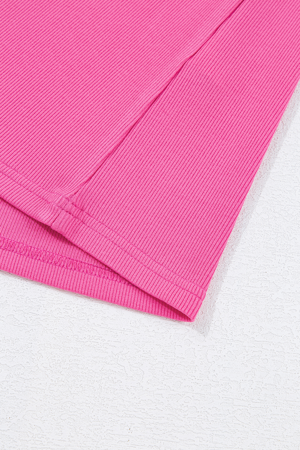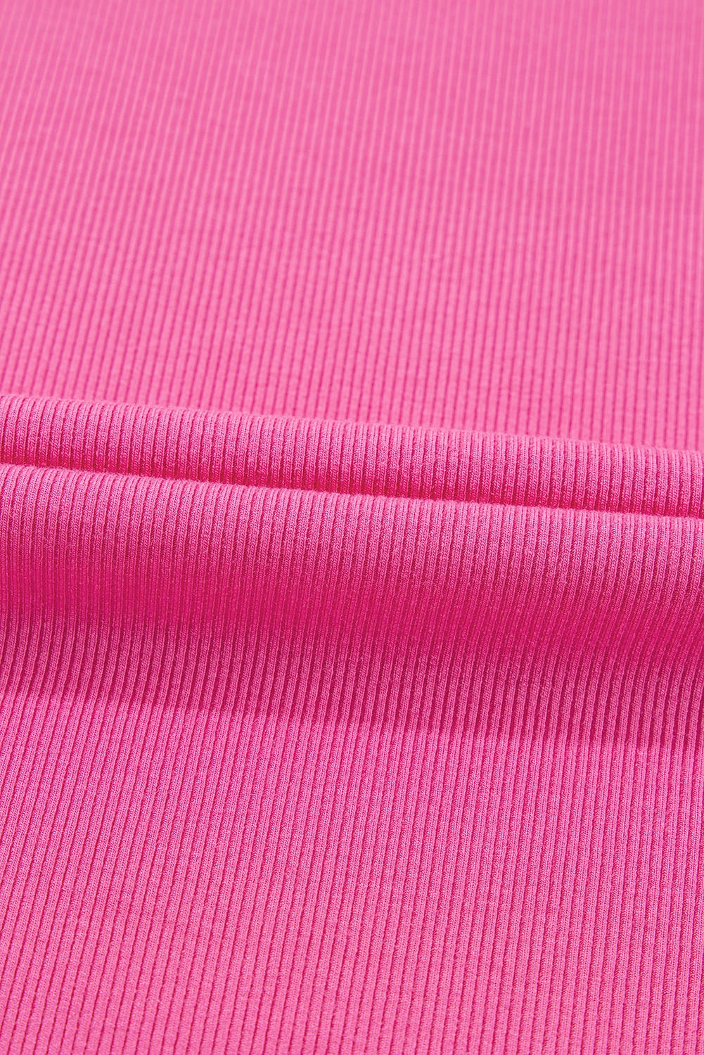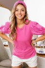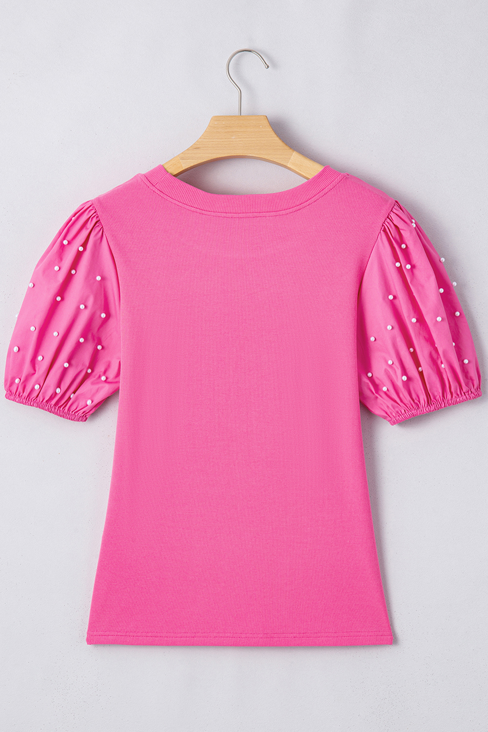 Bright Pink Ribbed Pearl Beaded Puff Sleeve Top