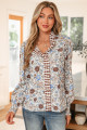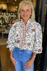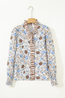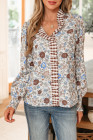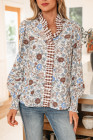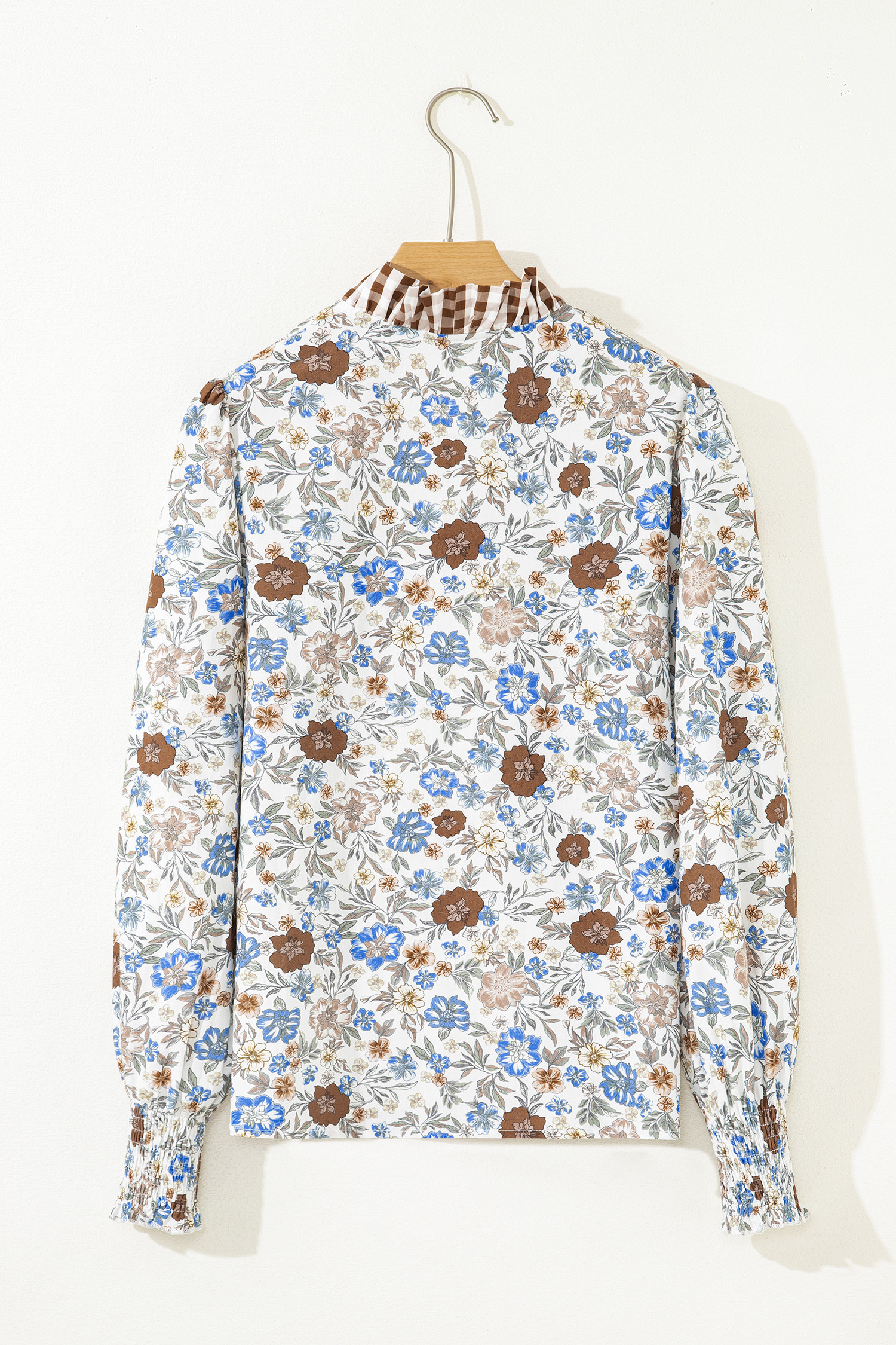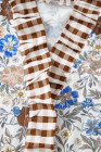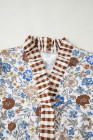 Brown Plaid Frilled Trim V Neck Floral Long Sleeve Blouse