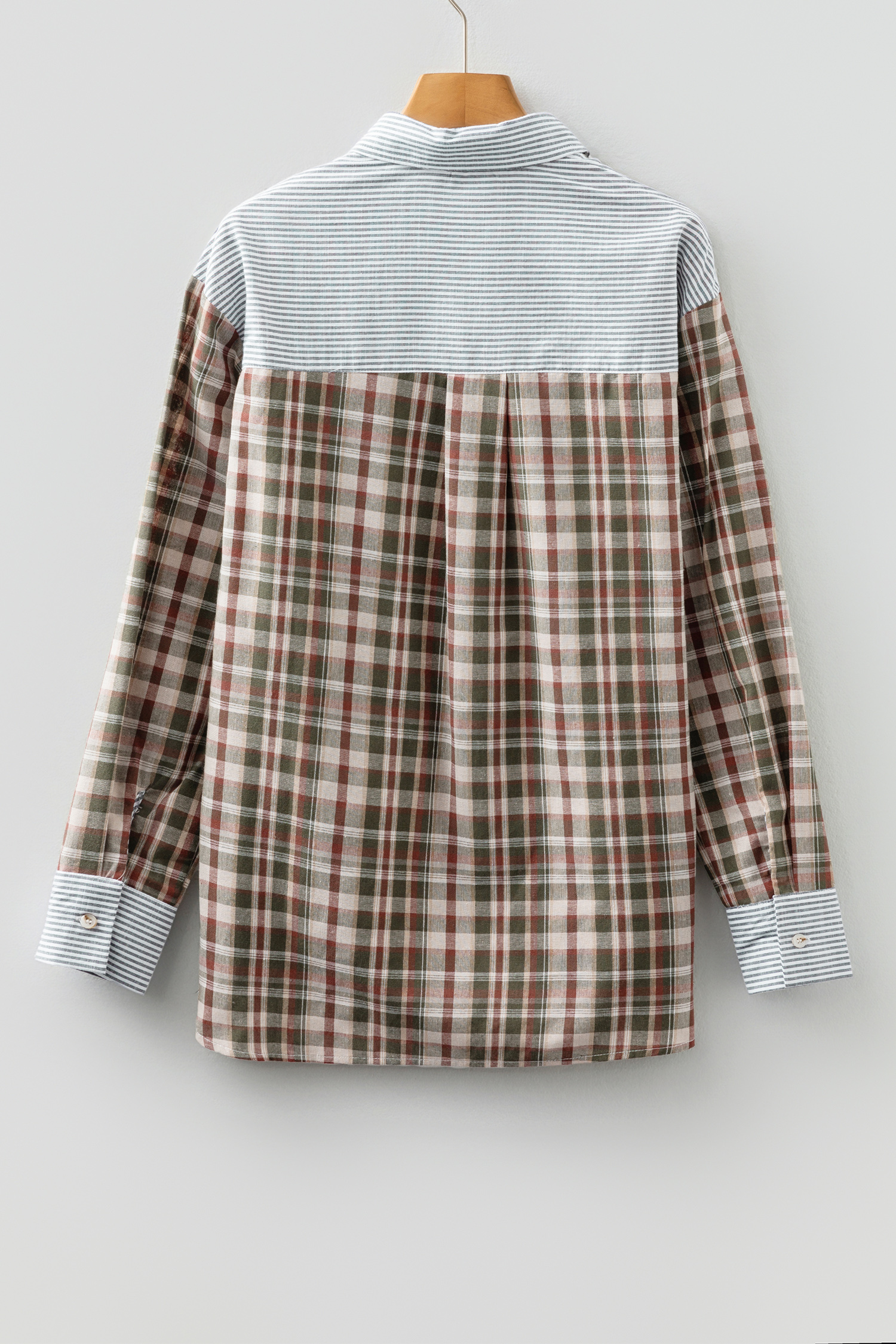 Brown Plaid Print Striped Patchwork Single Chest Pocket Buttoned Shirt