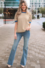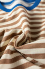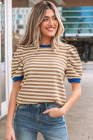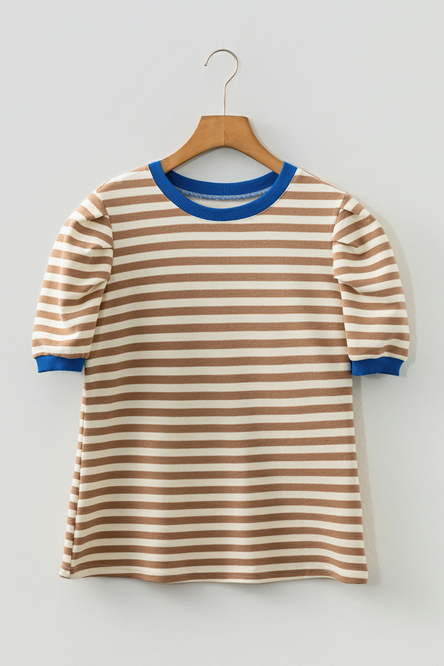 Brown Stripe Short Puff Sleeve Contrast Trim Round Neck Tee