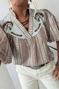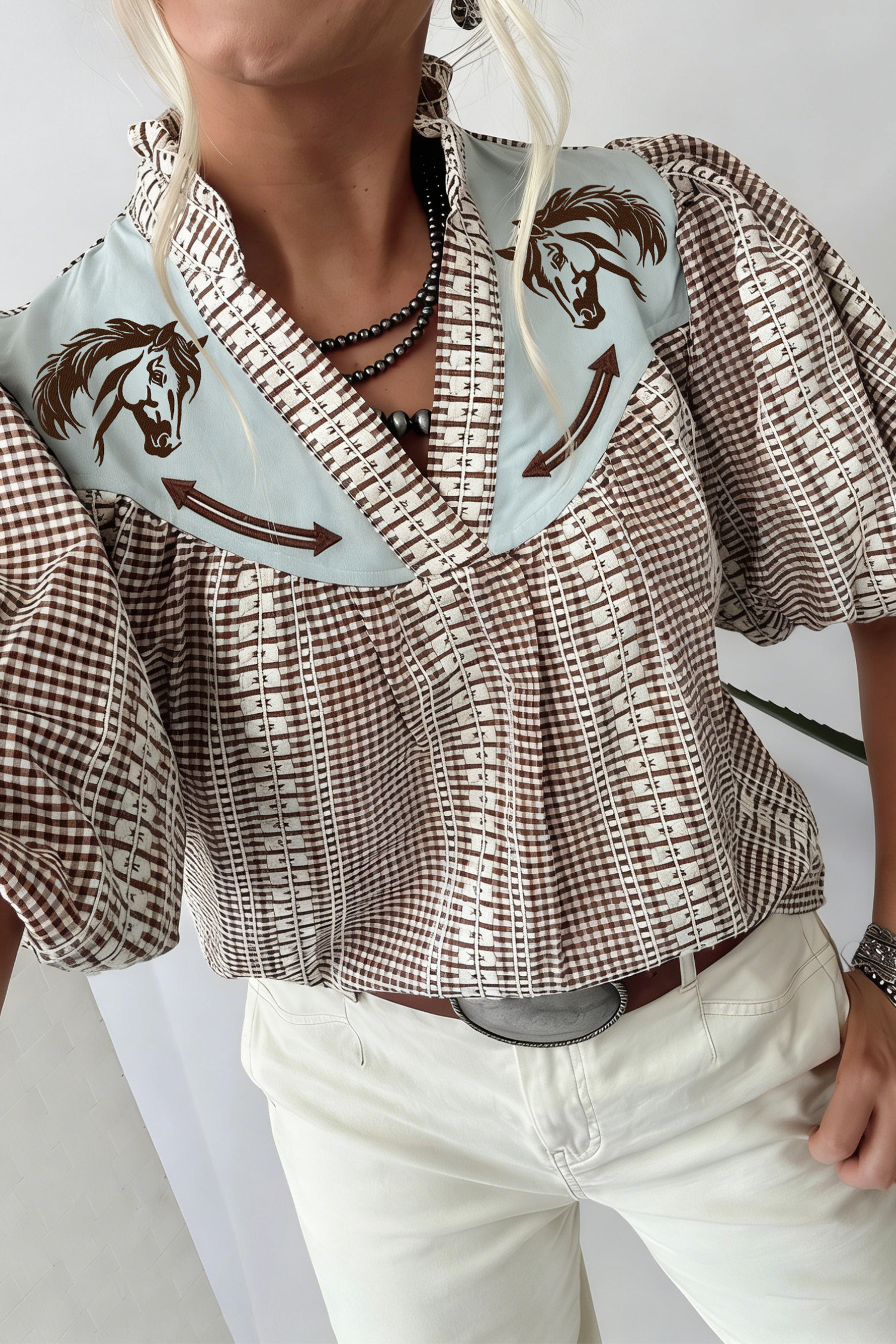 Brown Western Pony Embroidered Yoke Puff Sleeve Gingham Blouse