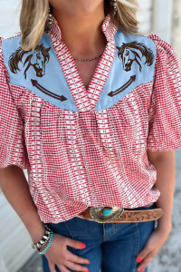 Western Pony Embroidered Yoke Puff Sleeve Gingham Blouse