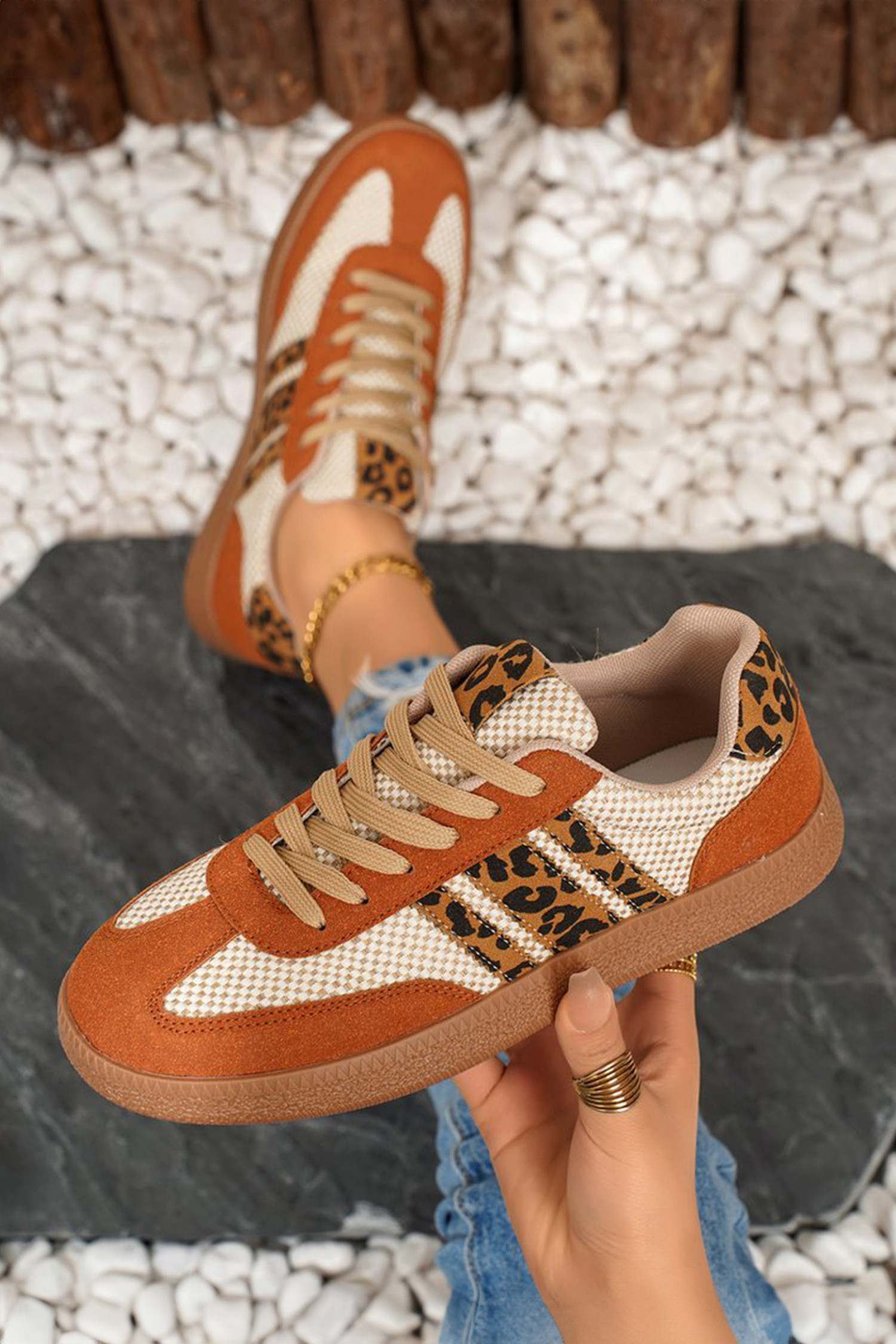 Buckskin Checkered Leopard Color Block Patchwork Lace Up Sneakers