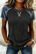 Carbon Grey Textured Knit Seam Detail Color Block Patchwork Short Sleeve Top