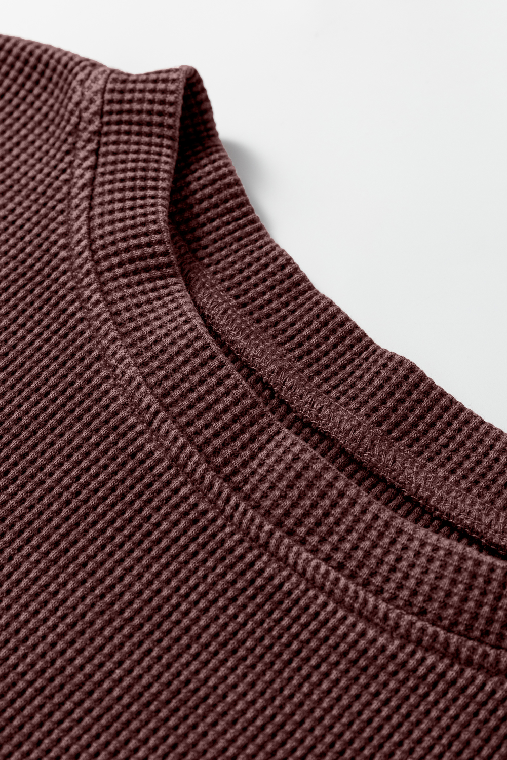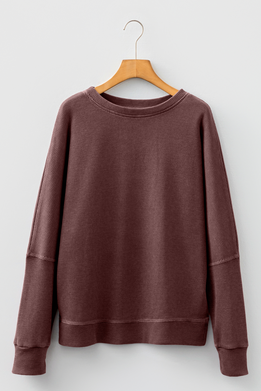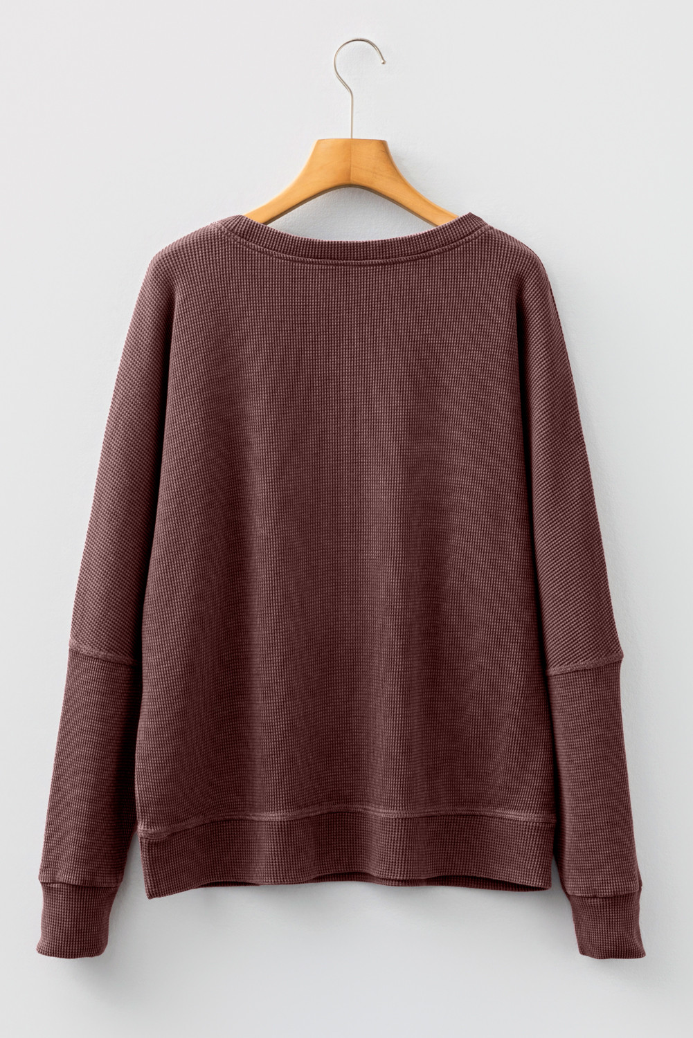 Dark Brown Waffle Knit Patchwork Long Sleeve Loose Top