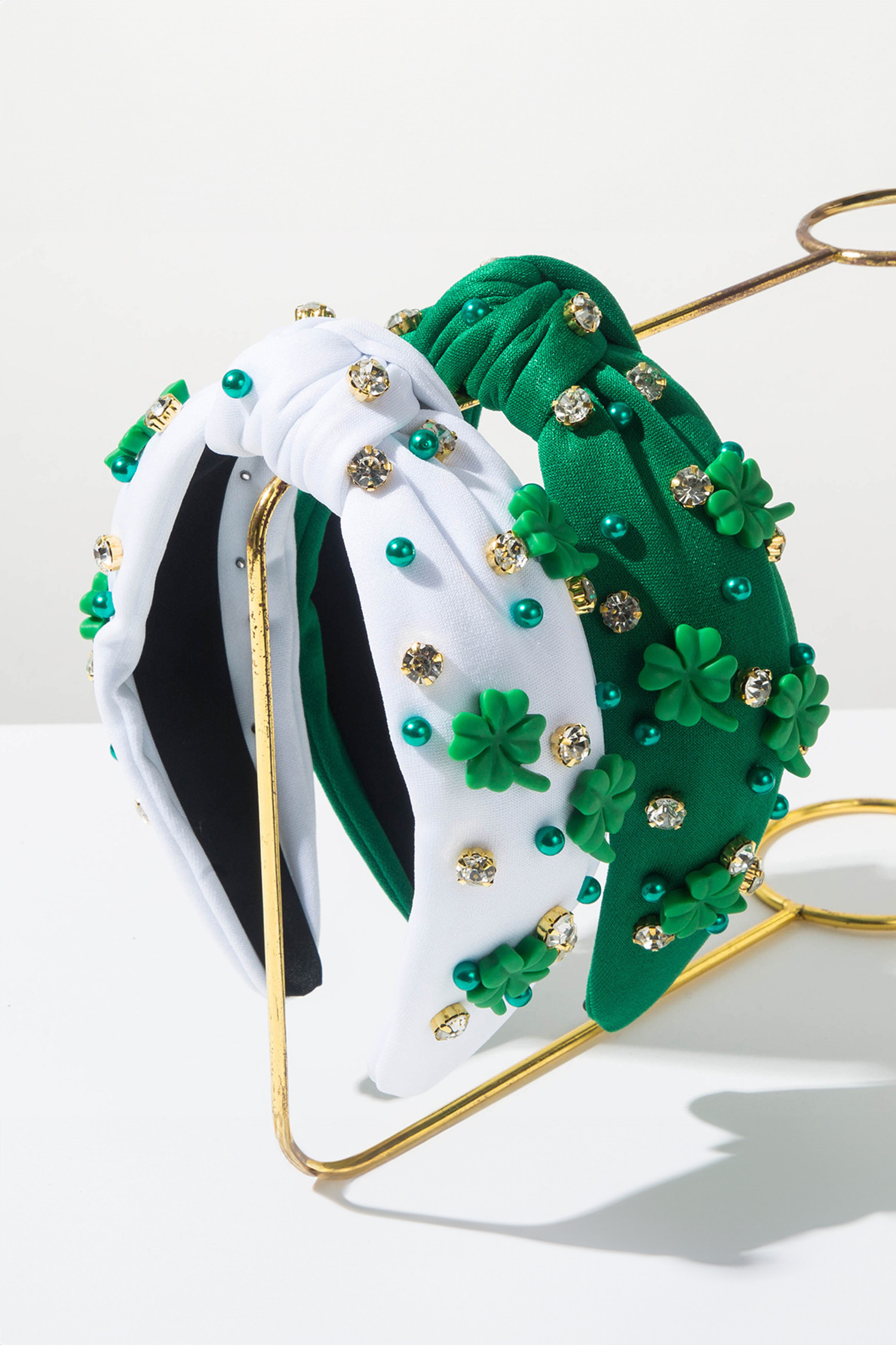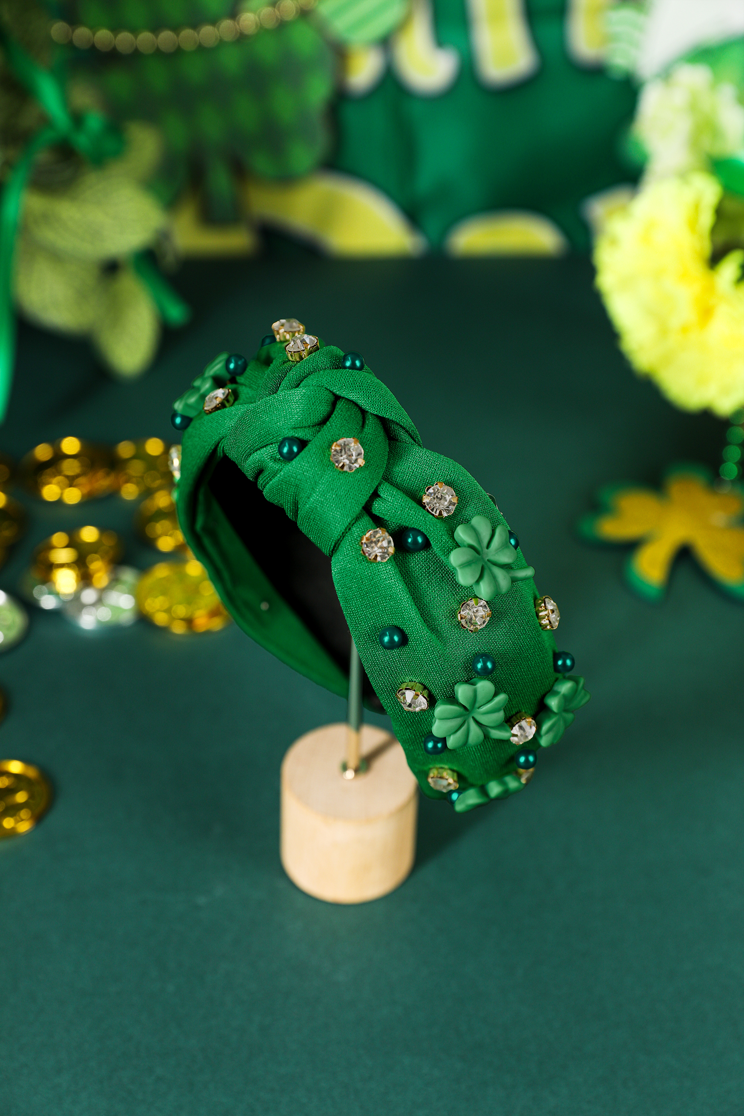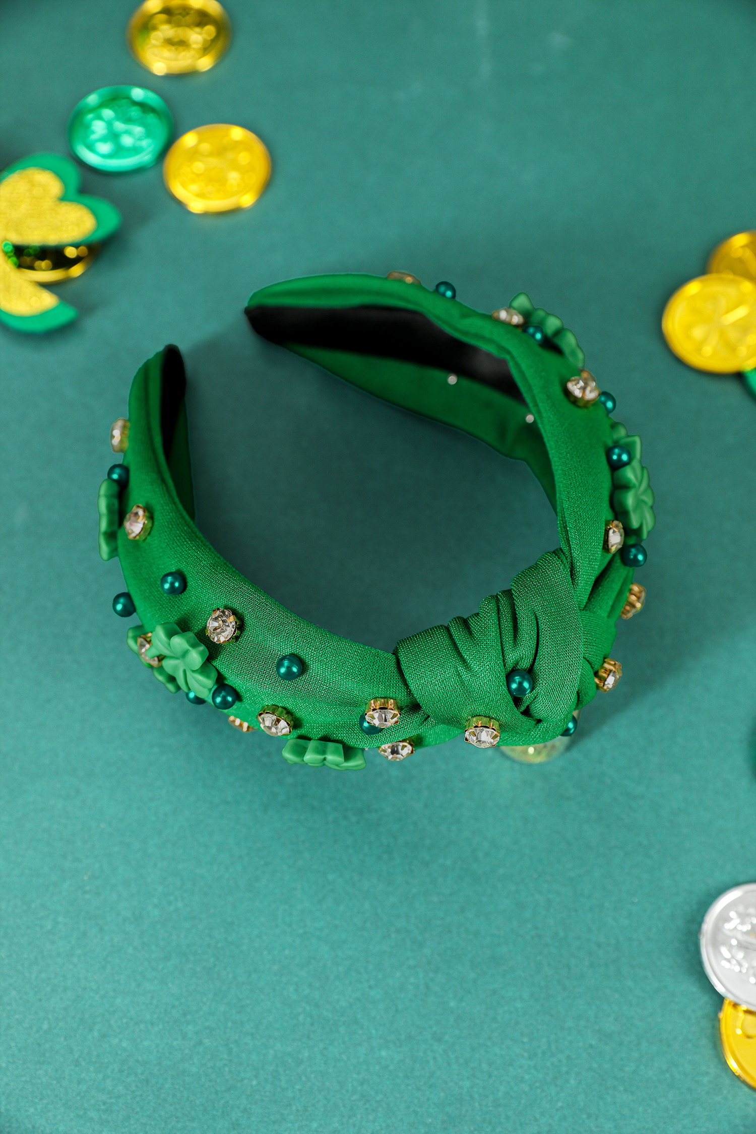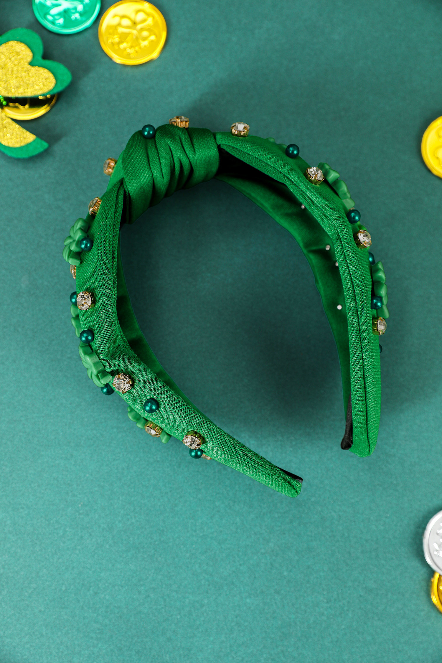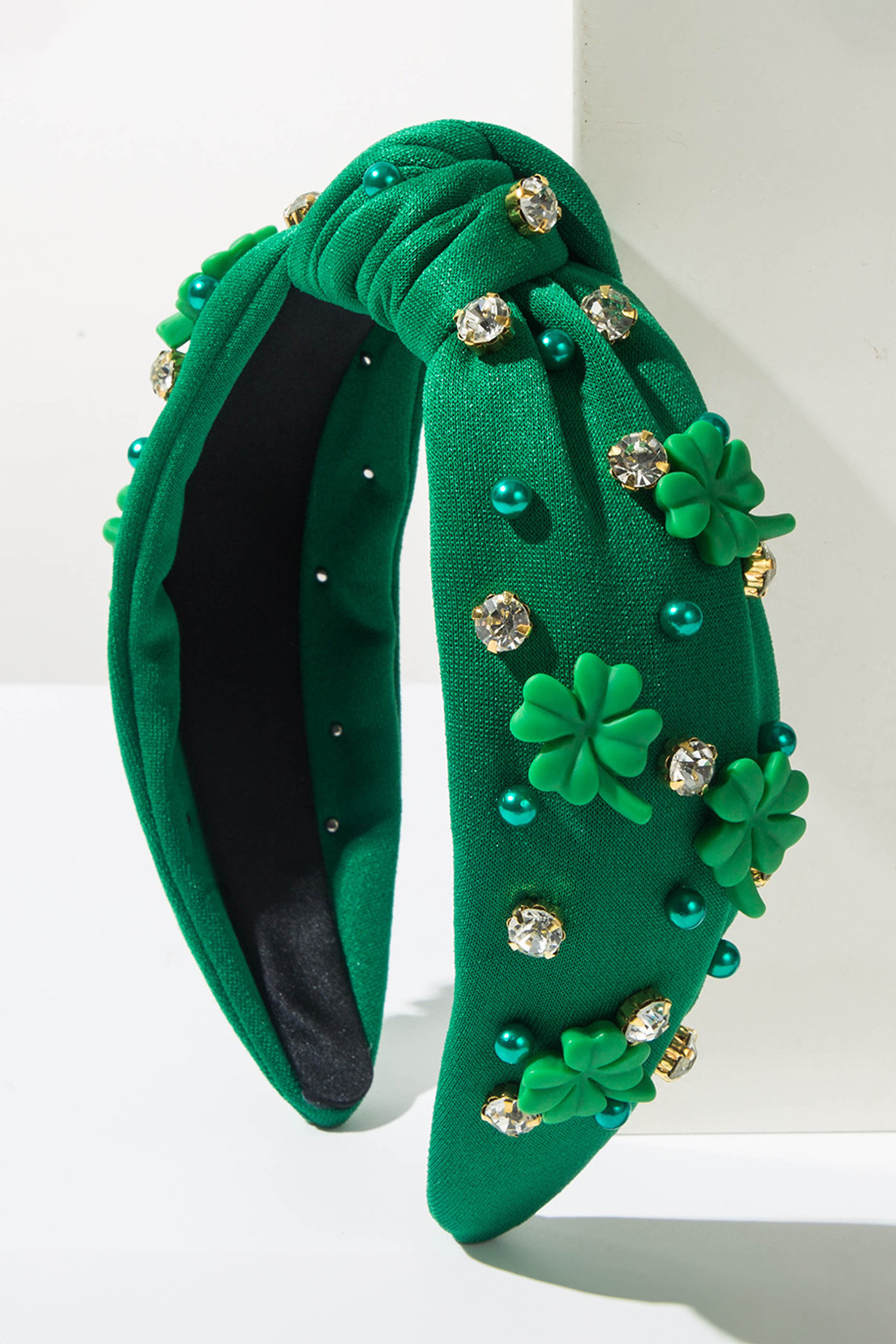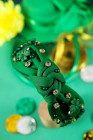 Dark Green Pearl Bead Rhinestone Embellished Lucky Clover Knotted Headband
