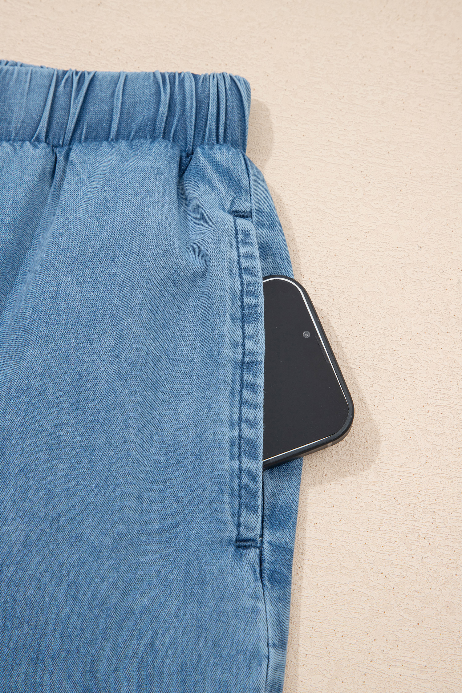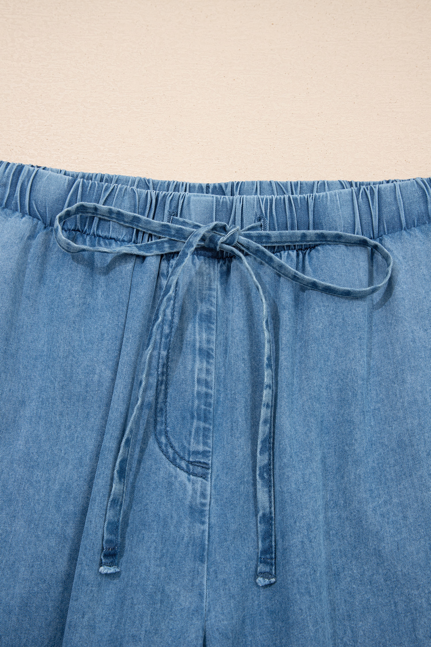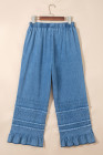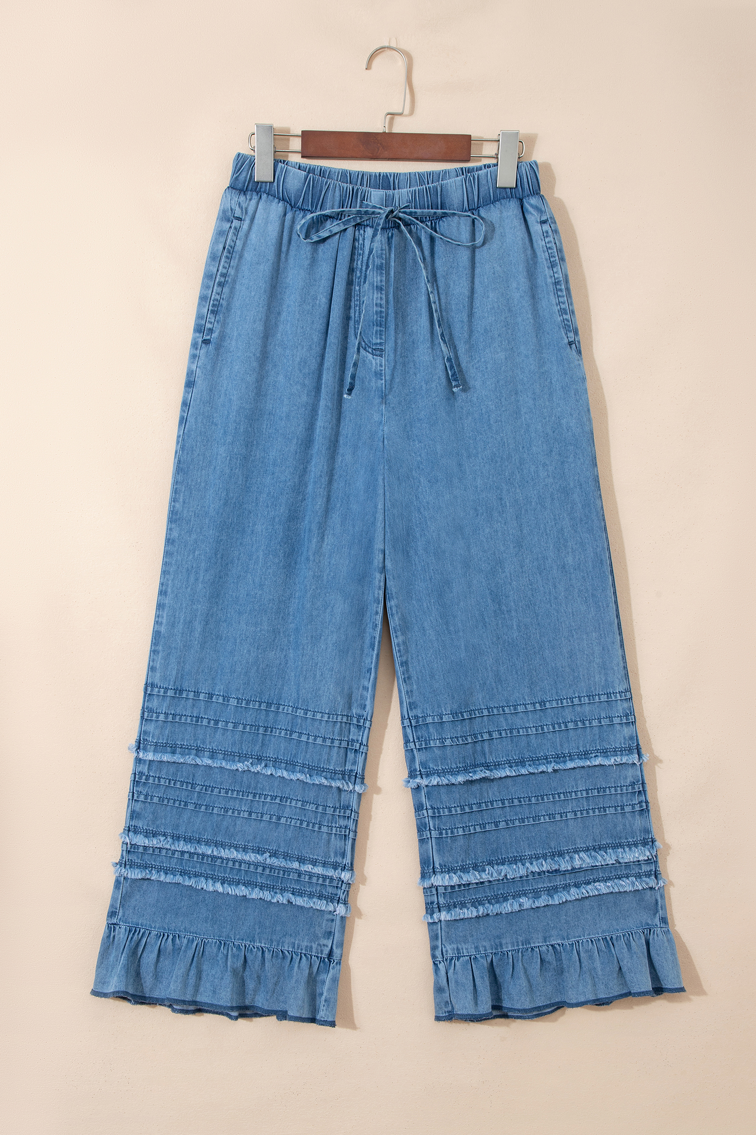 Dusk Blue Ruffled Hem Wide Leg Chambray Pants
