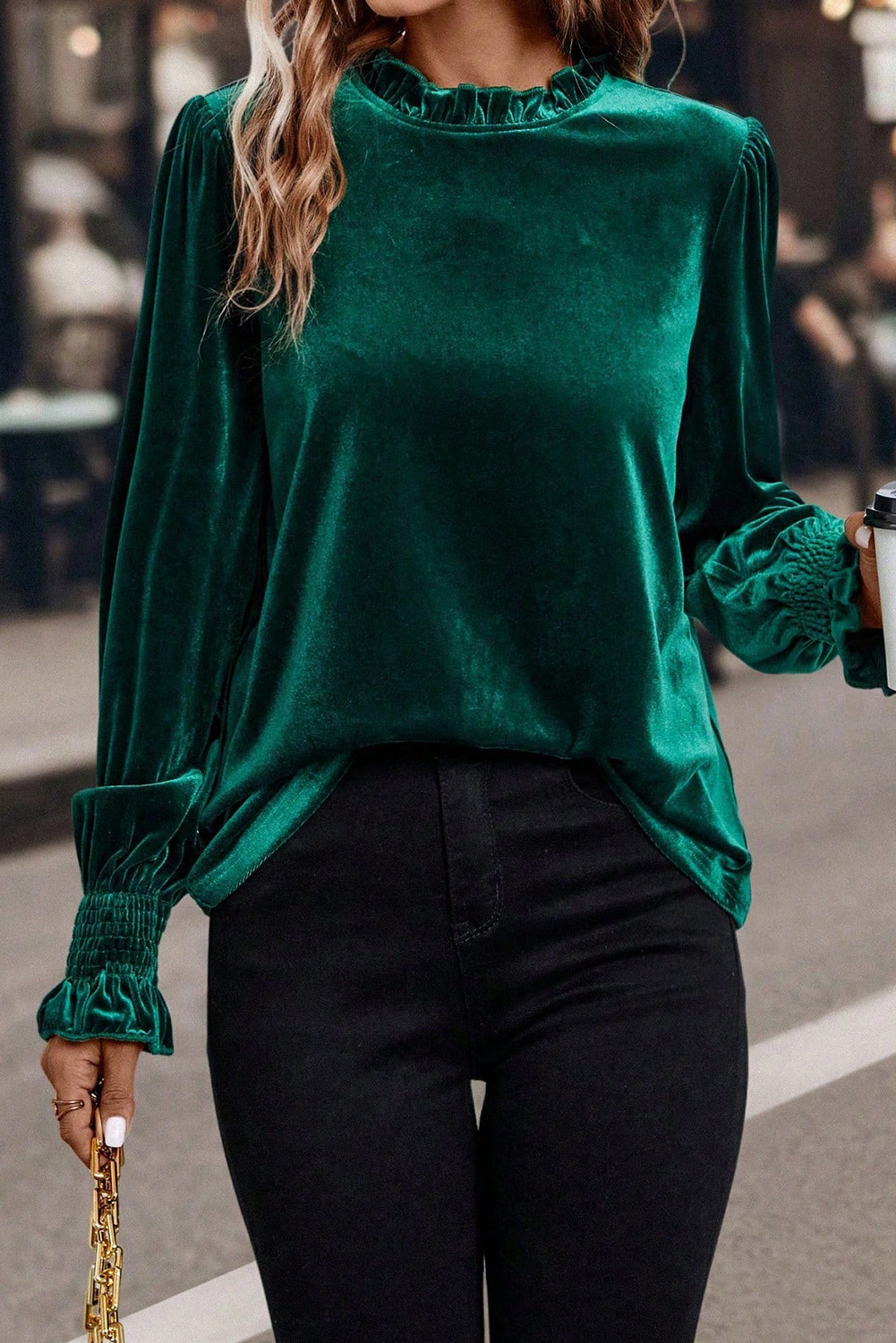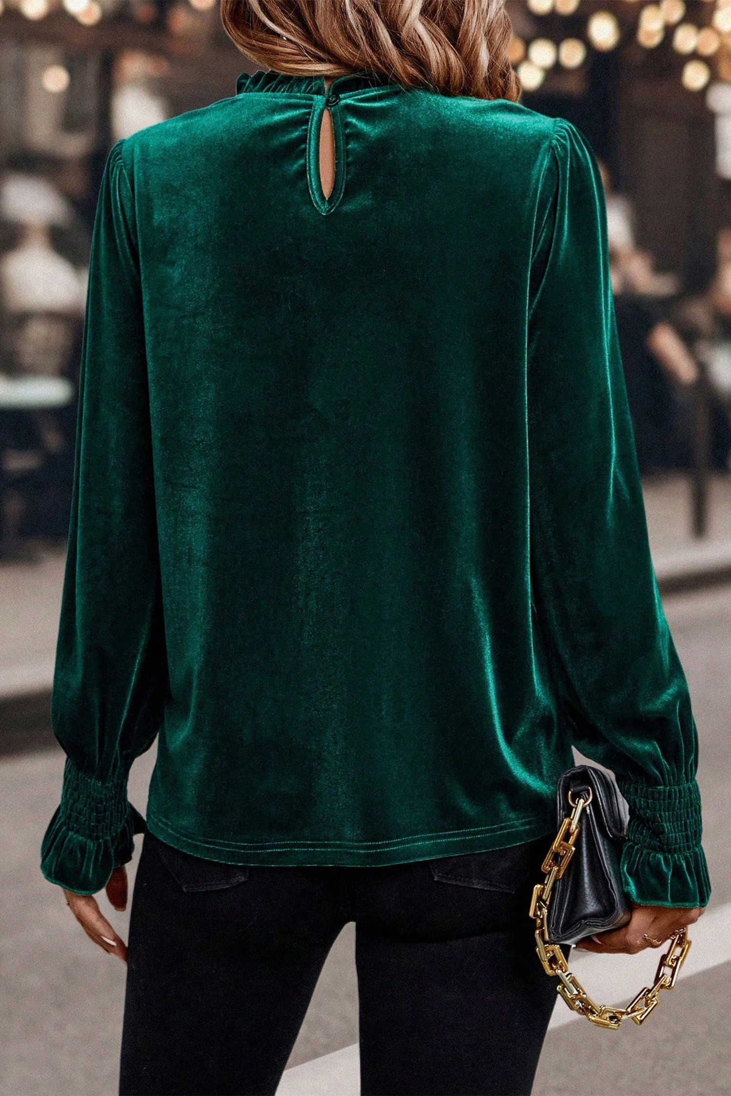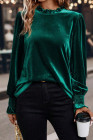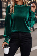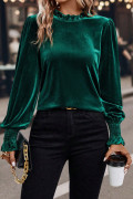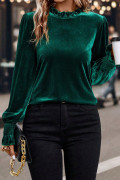Evergreen Frilled Collared Smocked Cuffs Puff Sleeve Velvet Blouse