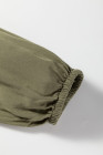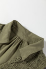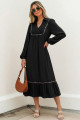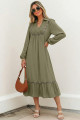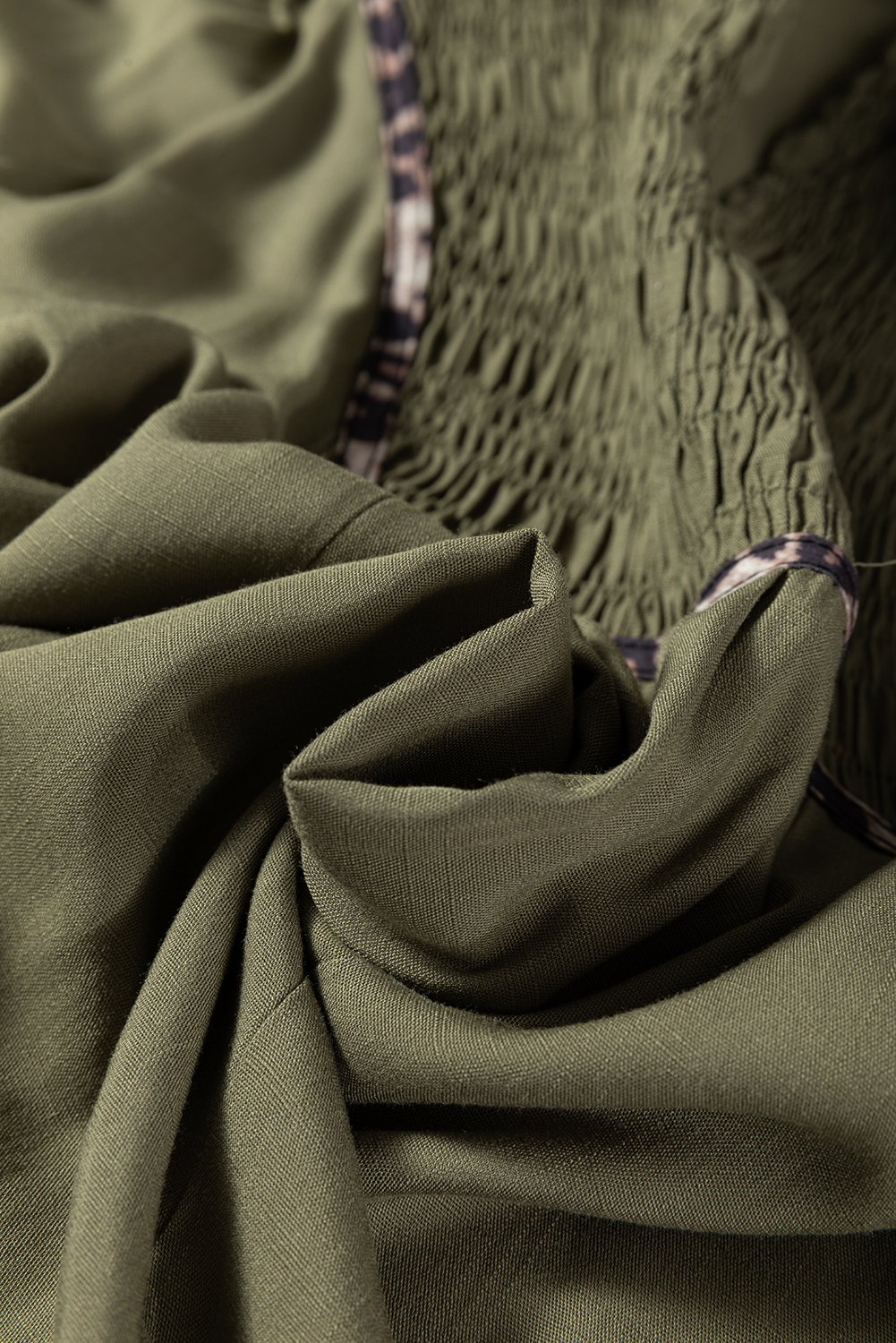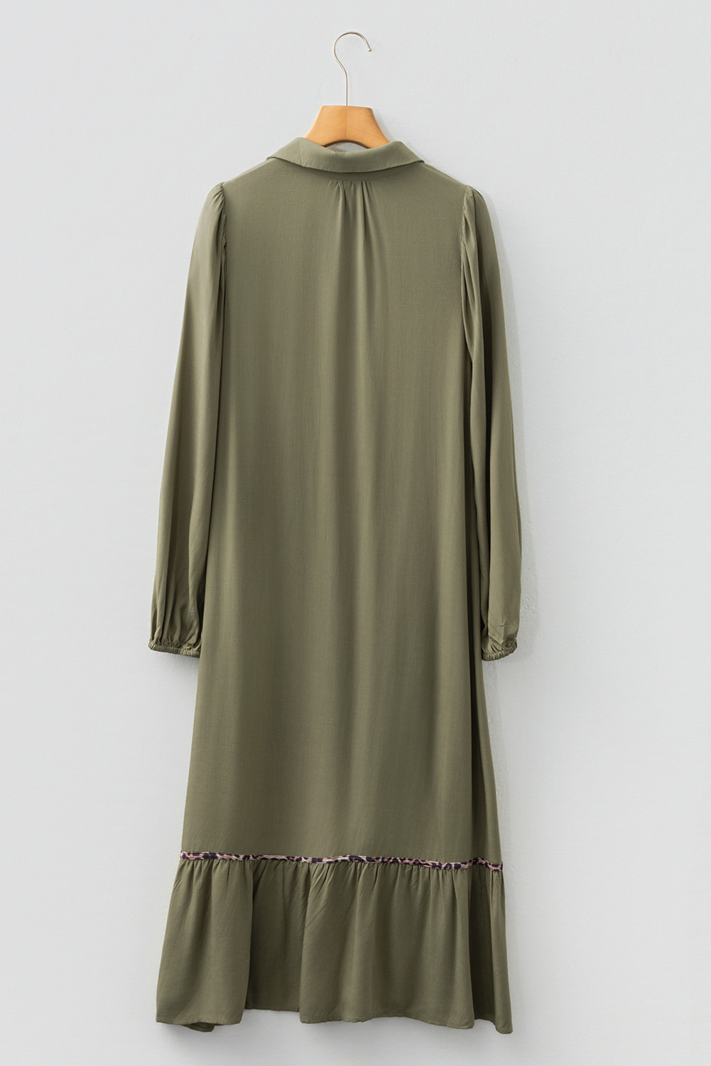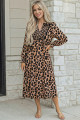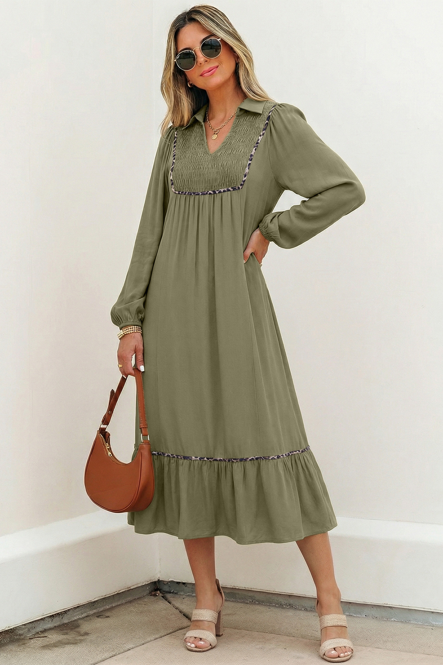 Four Leaf Clover Collared V Neck Smocked Detail Contrast Leopard Trim Bracelet Sleeve Long Dress