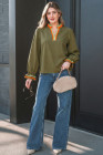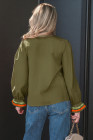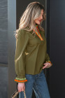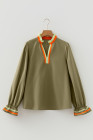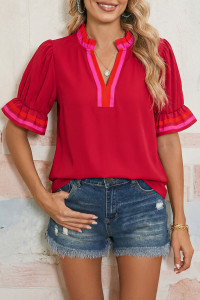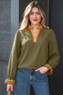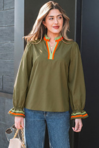 Four Leaf Clover Striped Trim Ruffle Split Neck Long Sleeve Blouse