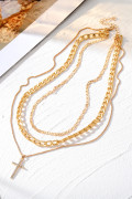 Gold Plated Cross Pendant Multi Layer Stacked Chains Necklace