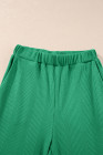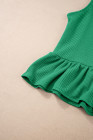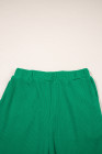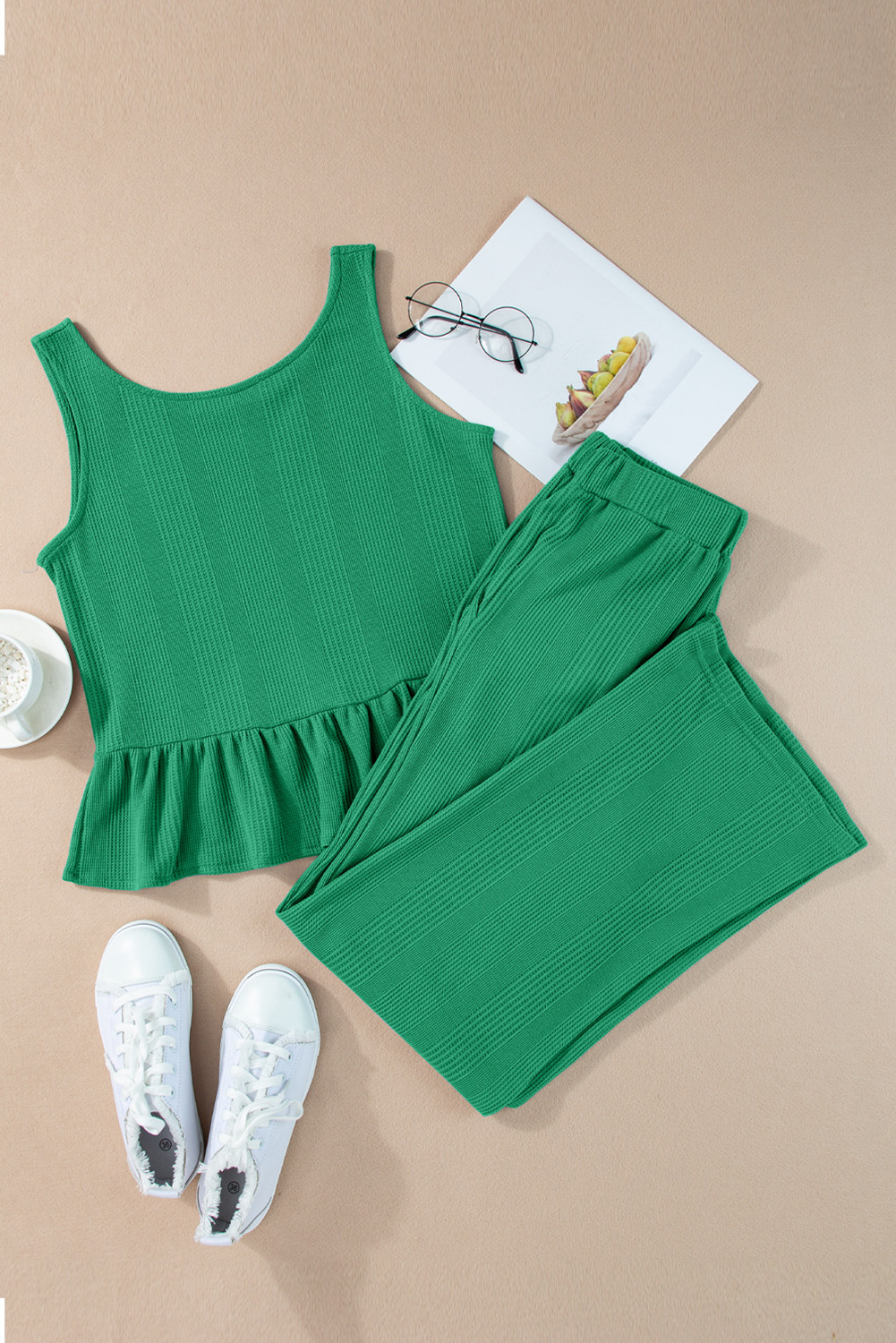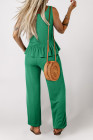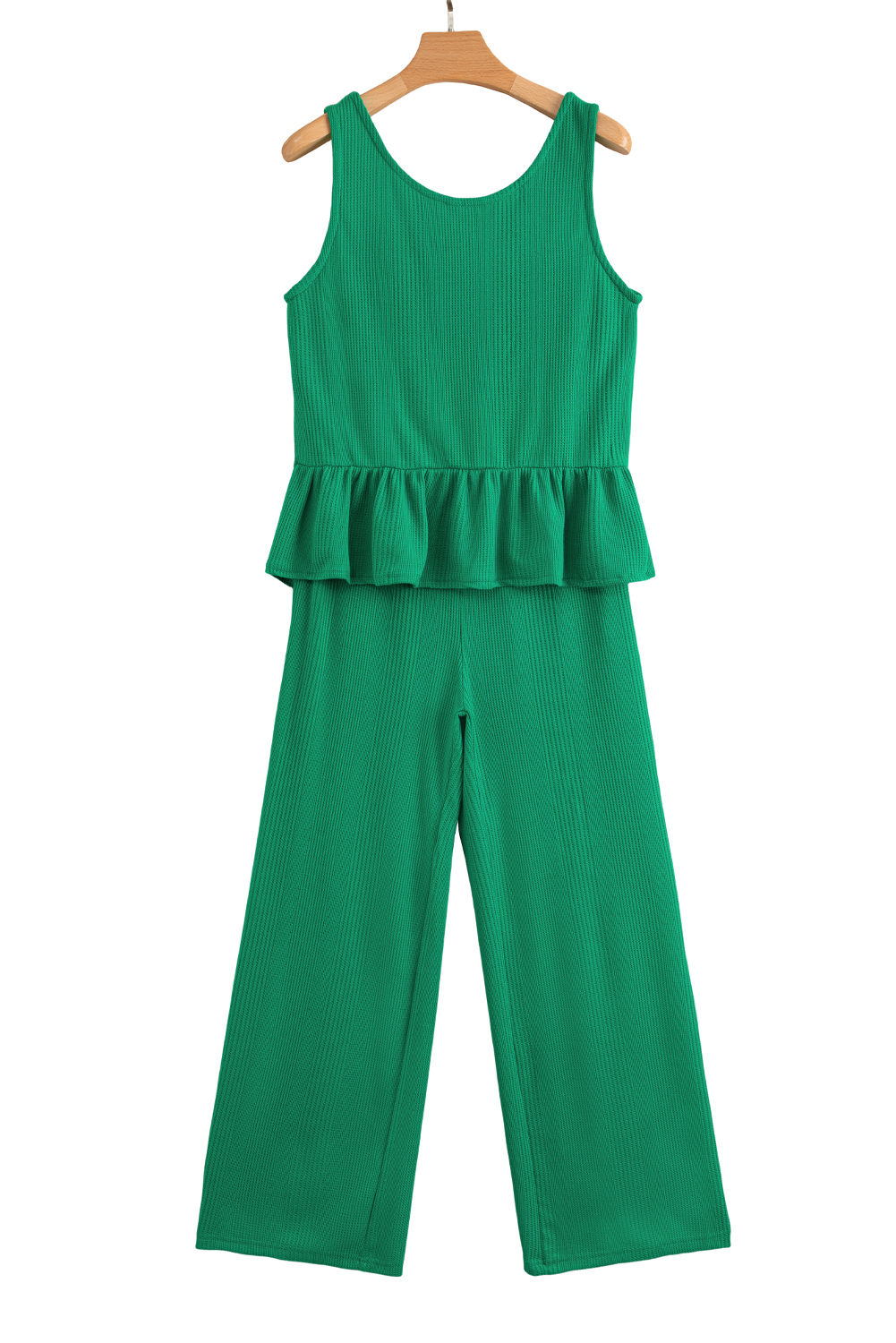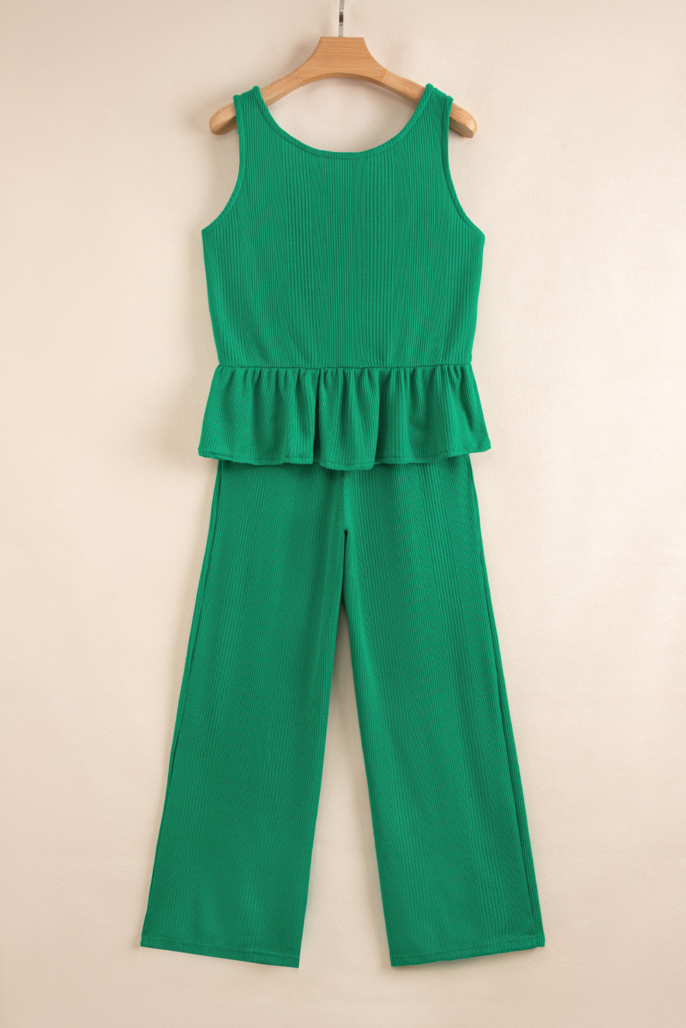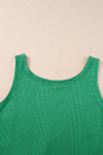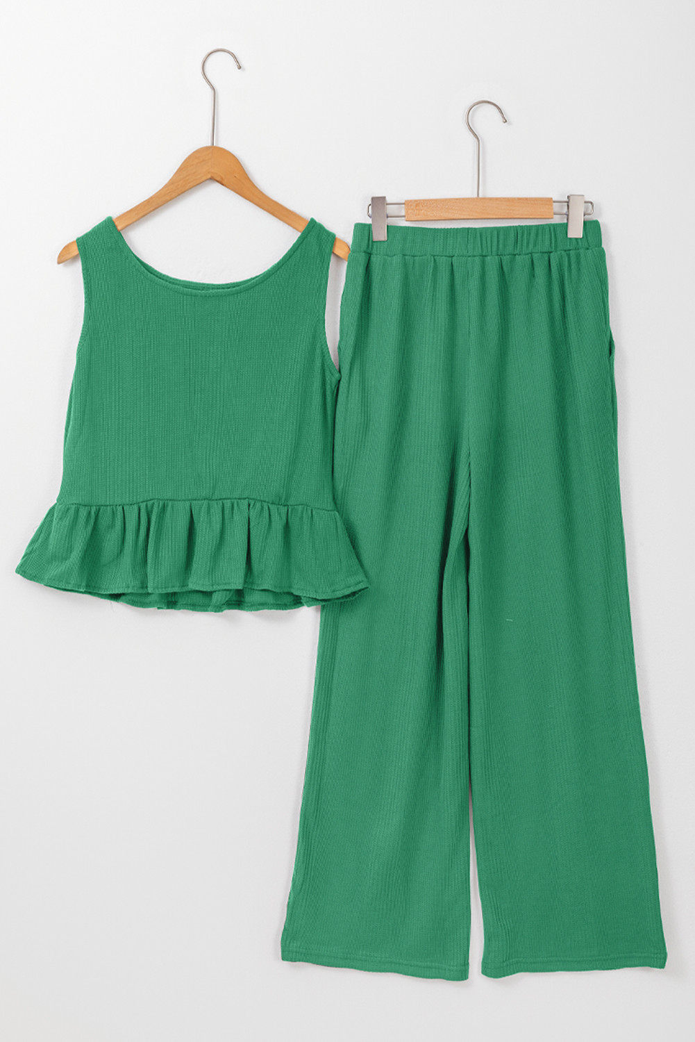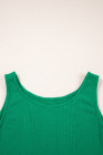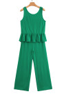Green Solid Color Ribbed Ruffle Tank Top and Pants Set