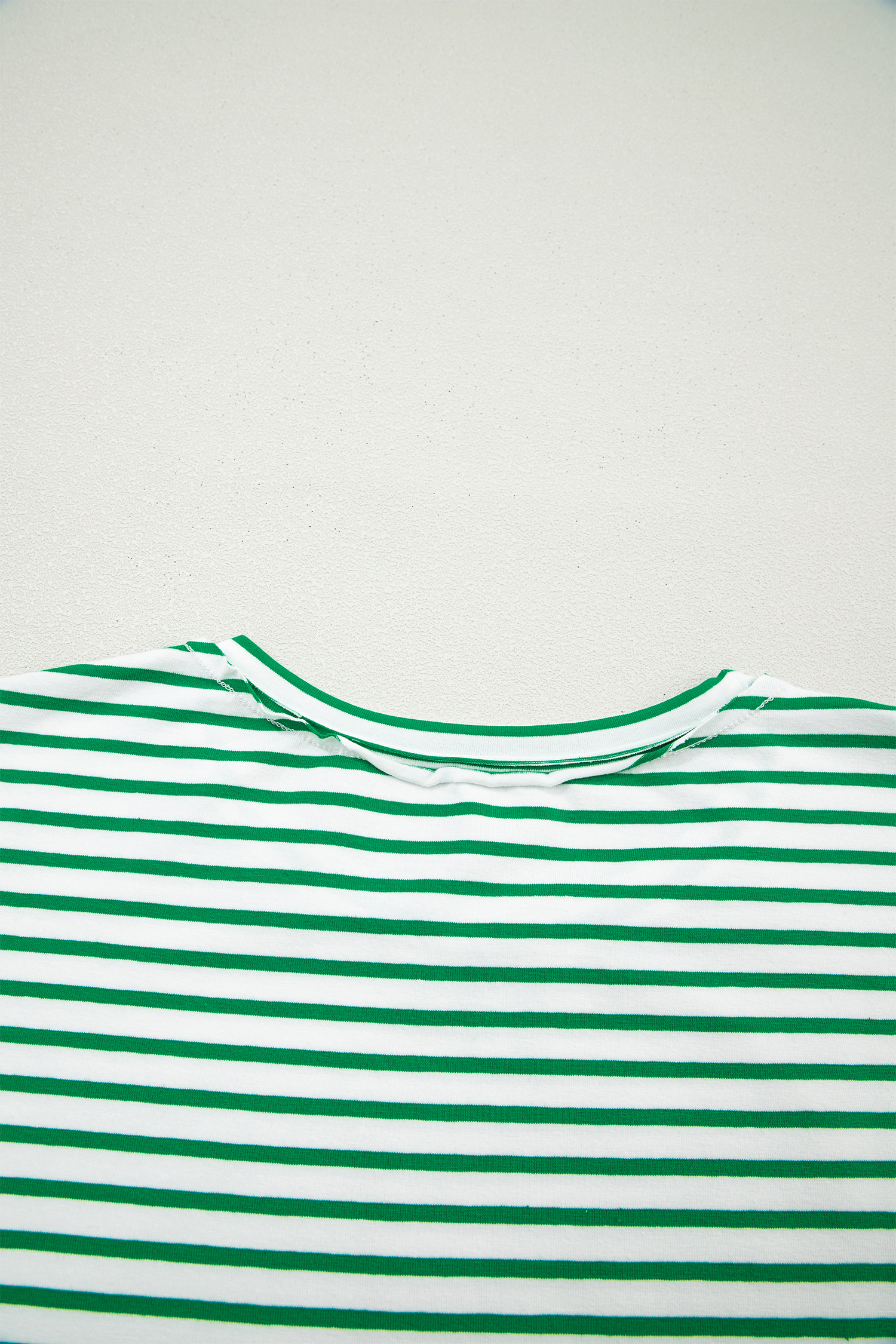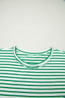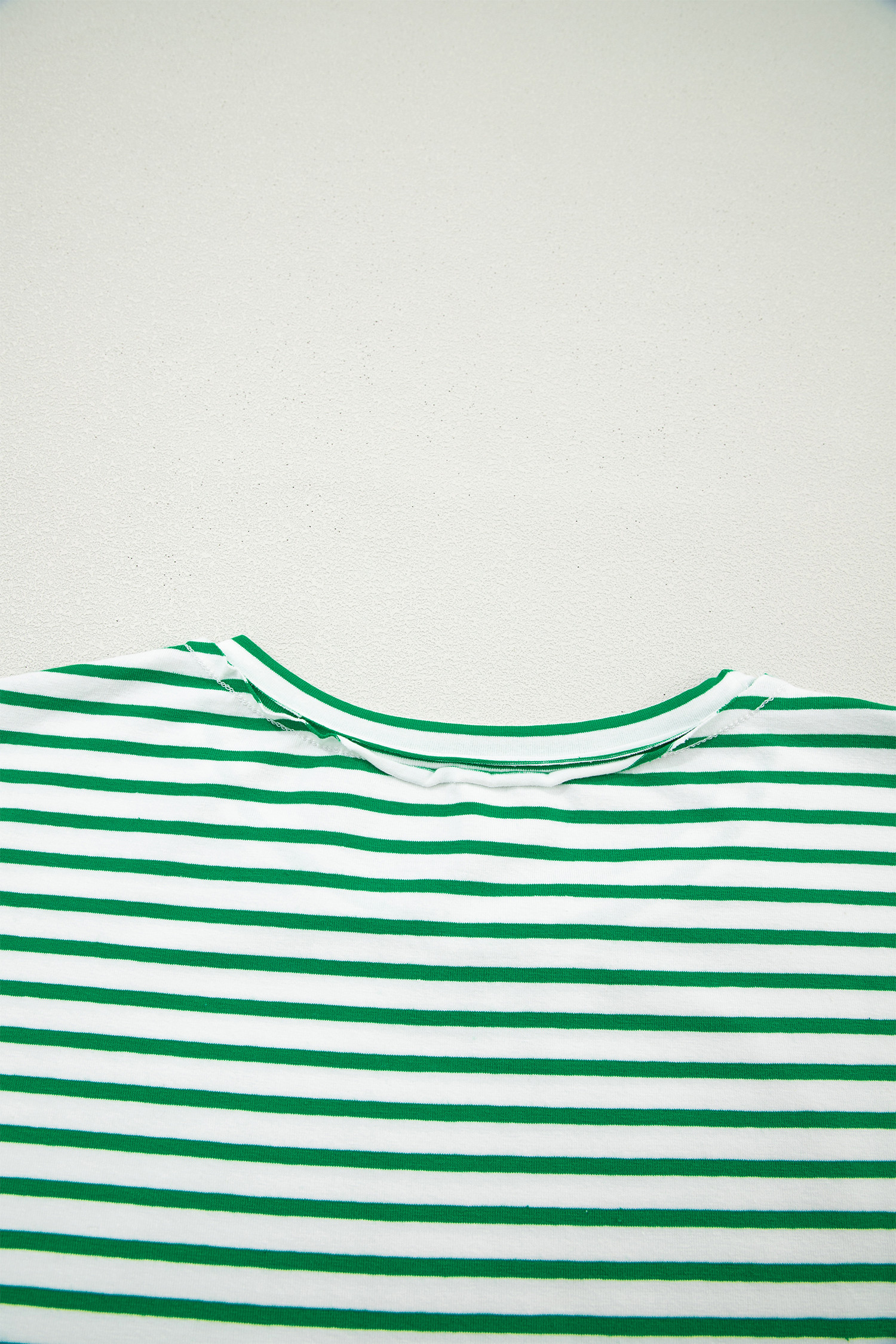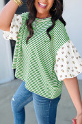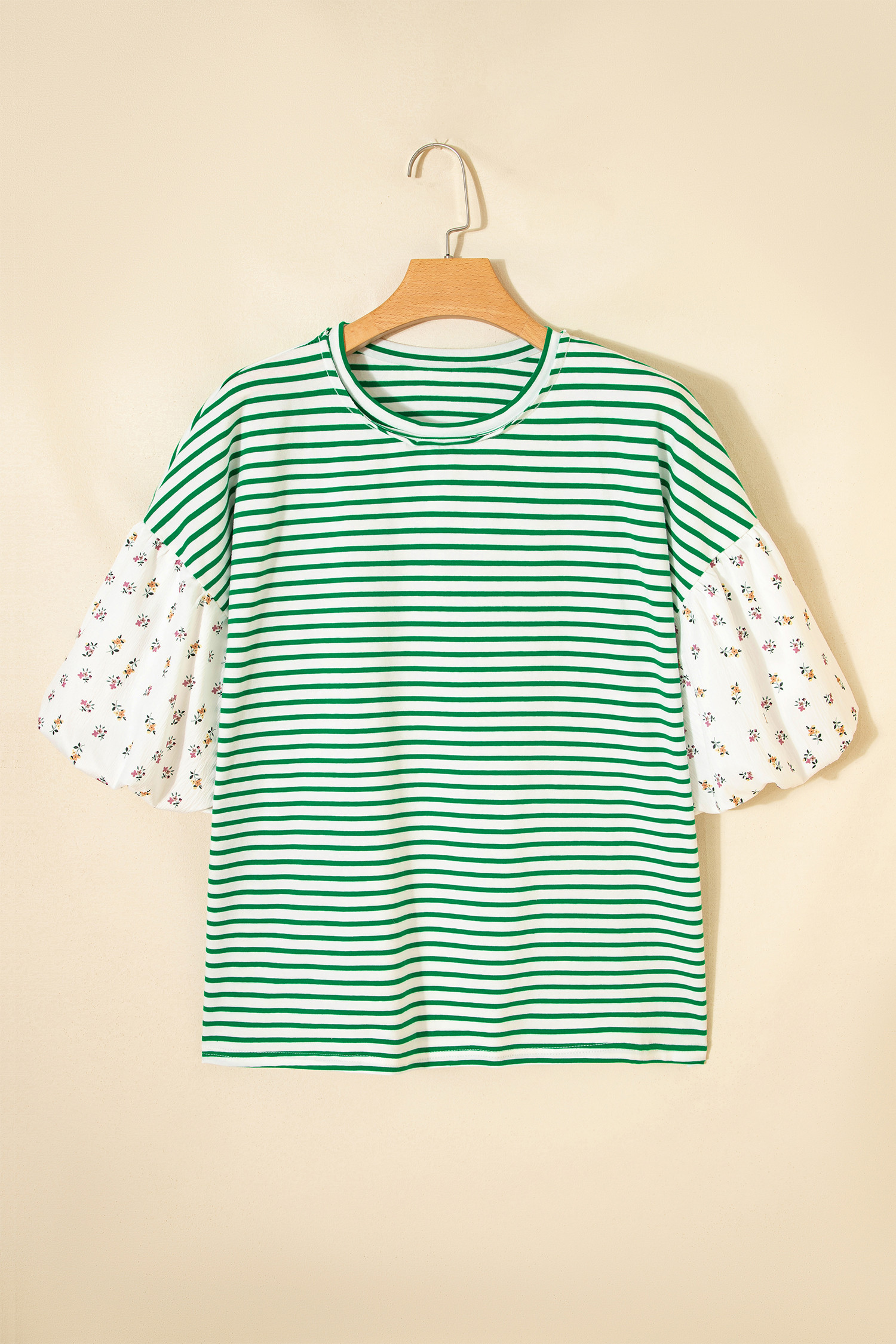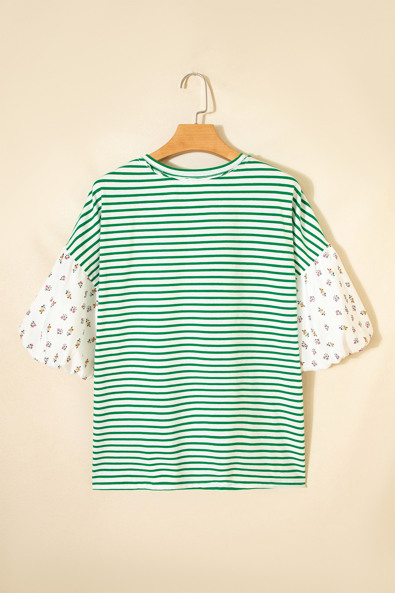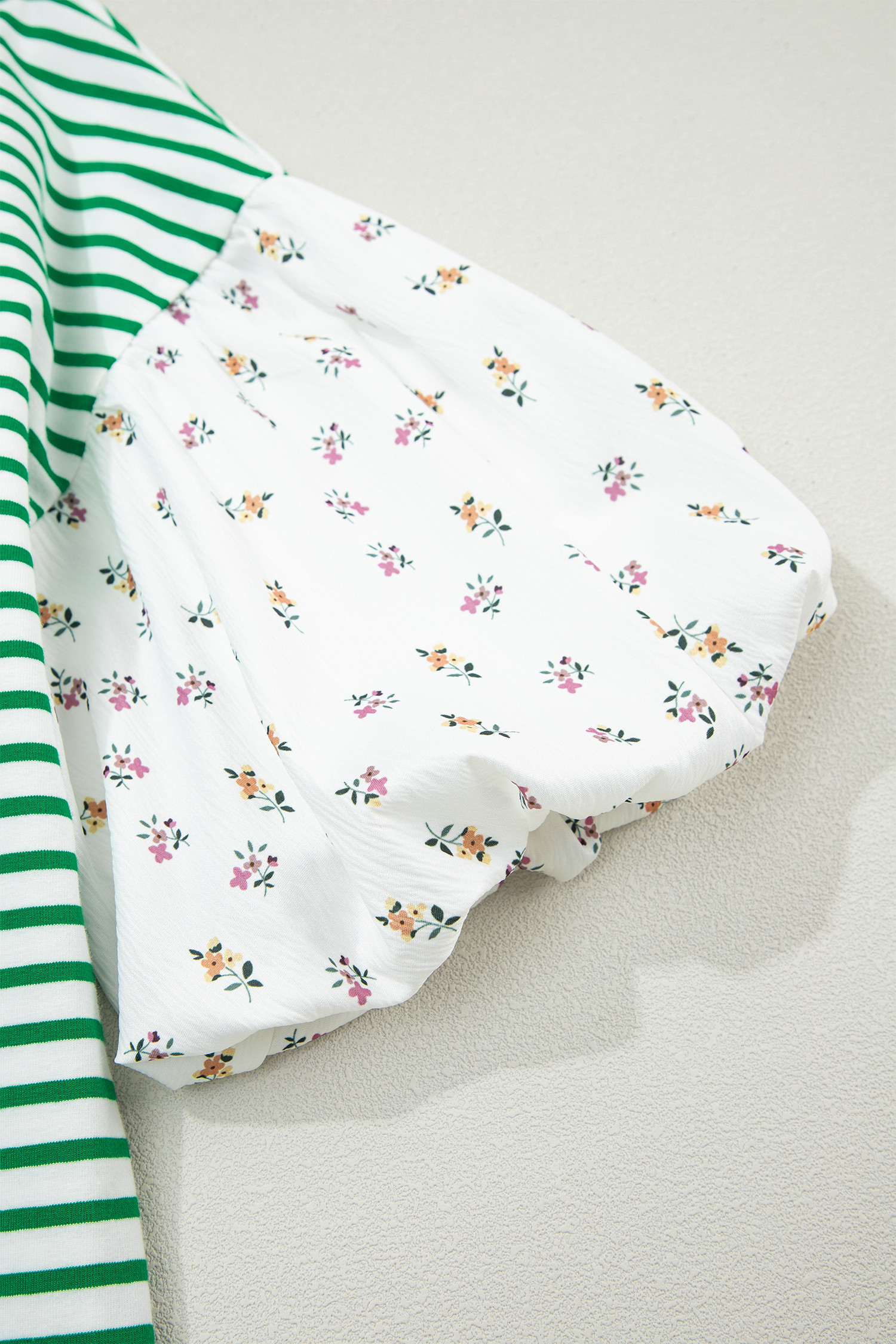 Green Stripe Floral Puff Sleeve Patchwork Round Neck Loose Top