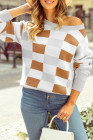 Khaki Checkered Ribbed Edge O Neck Drop Shoulder Sweater