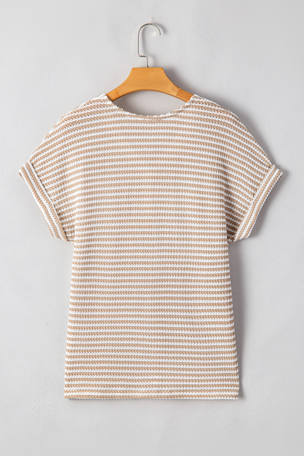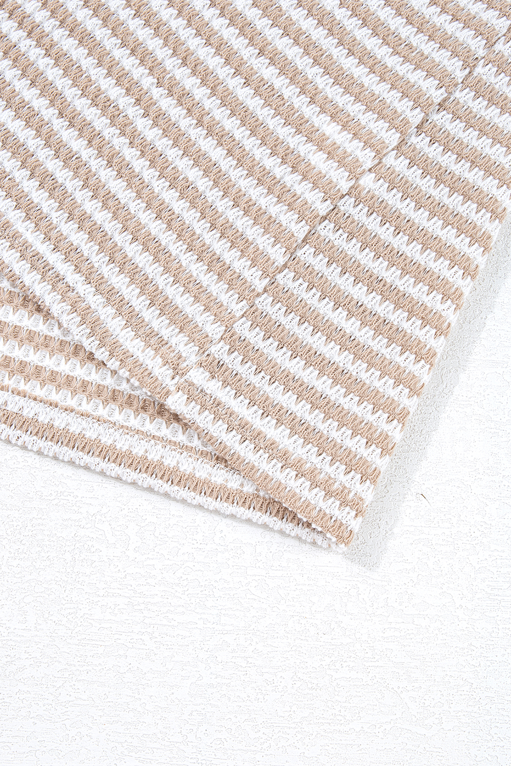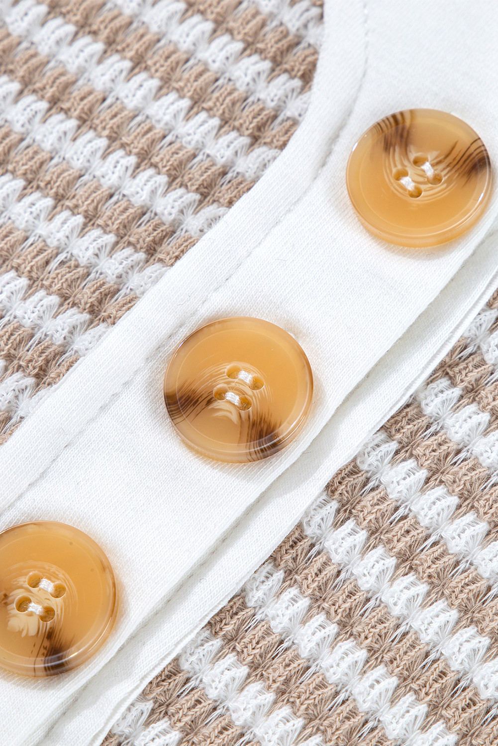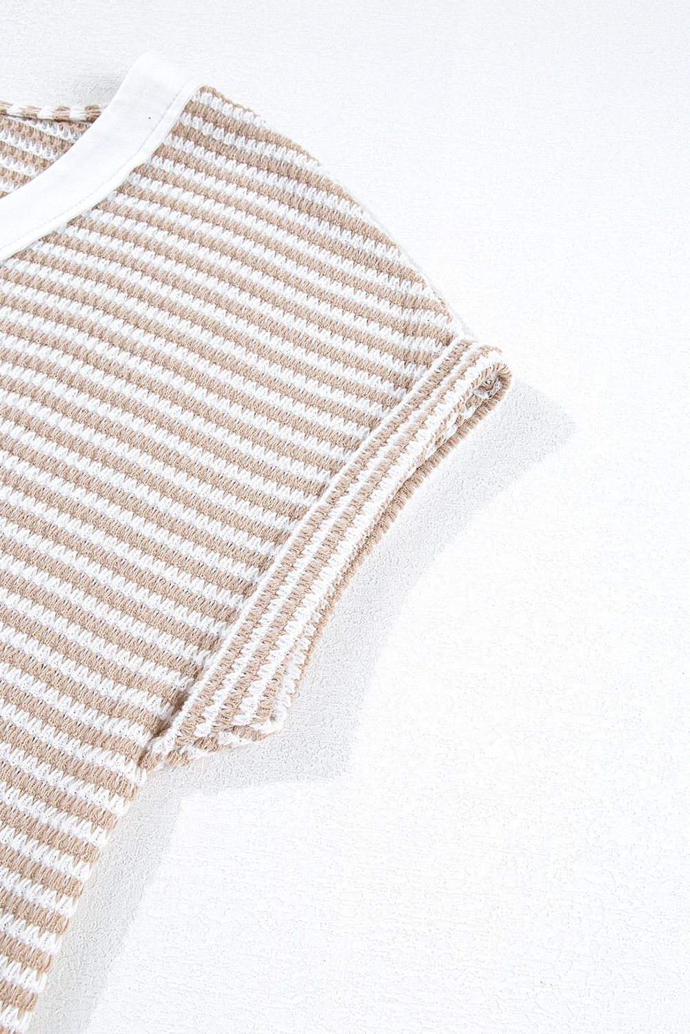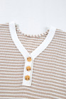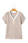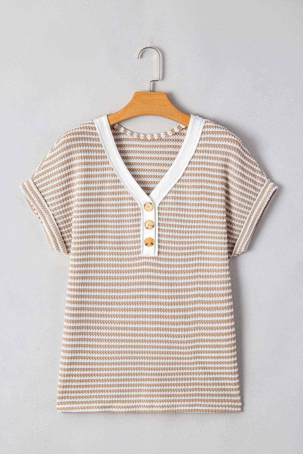 Khaki Stripe Buttoned Front V Neck Knitted T Shirt