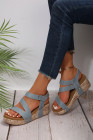 Light Blue Hollow Out Velcro Leather Wedge Sandals