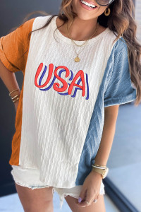 Light Blue USA Embroidered Cable Textured Knit Cuffed Sleeve Colorblock Tee