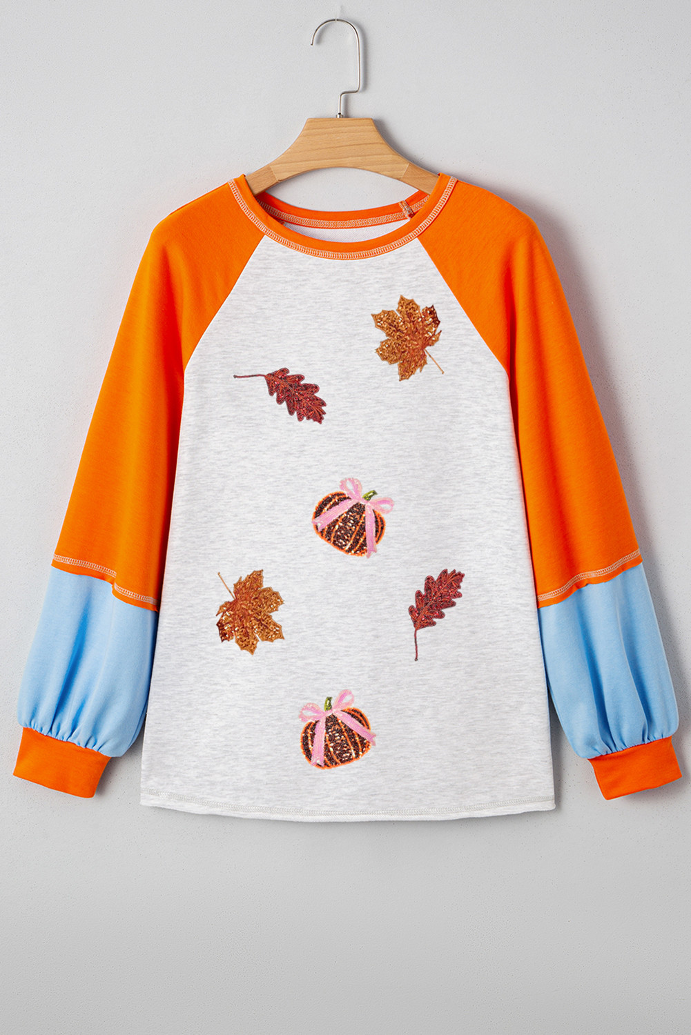 Light Grey Sequin Fall Elements Patched Color Block Patchwork Long Sleeve Loose Top