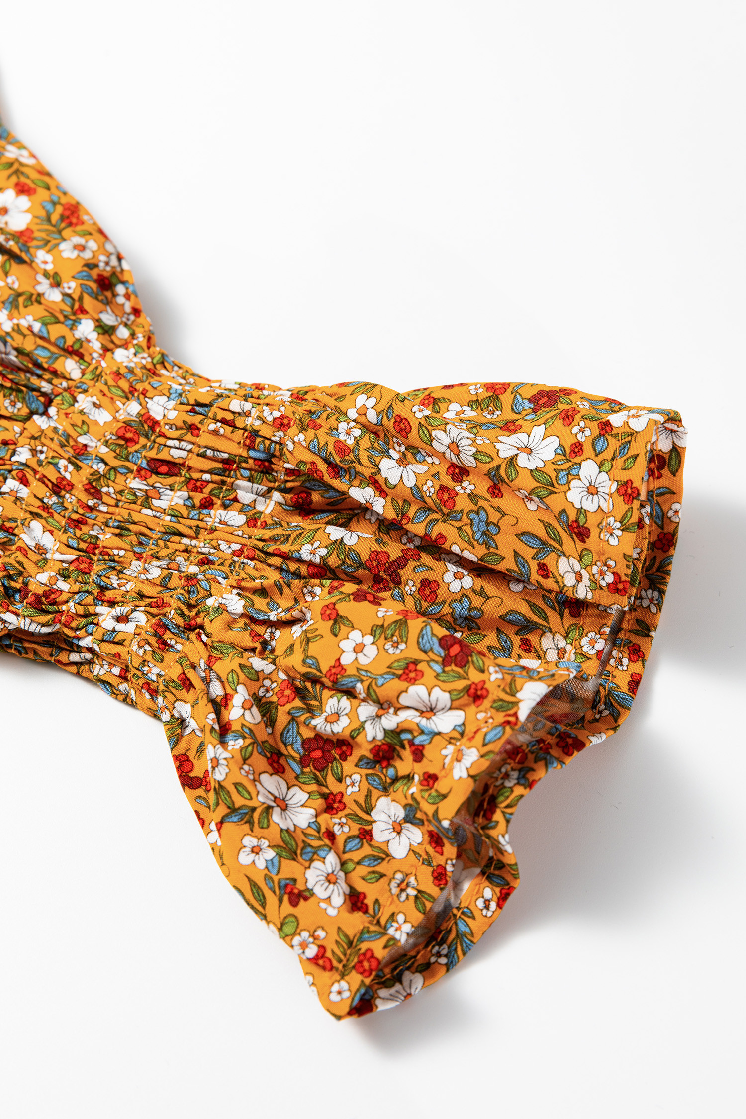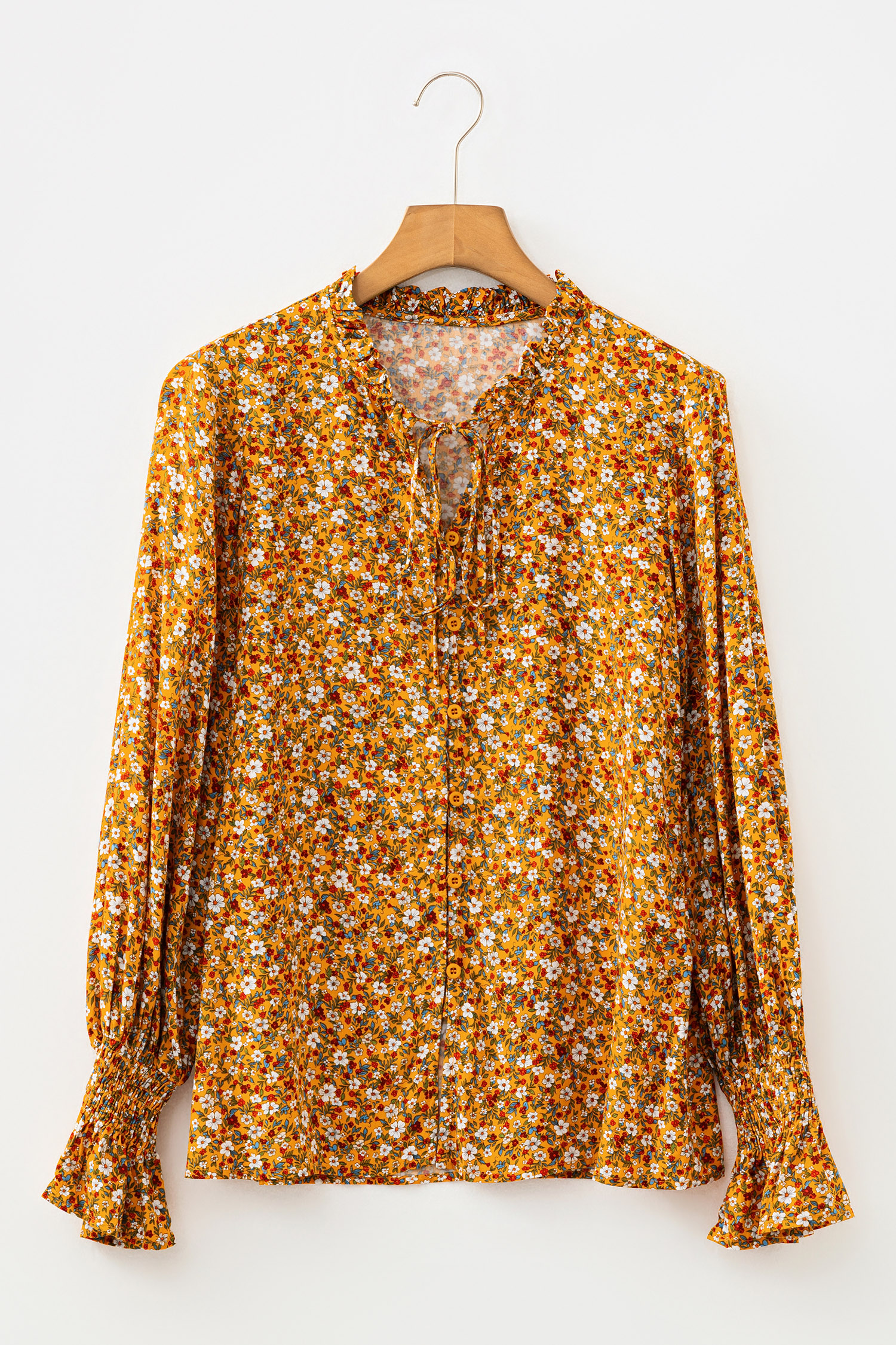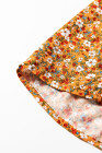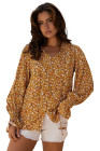 Orange Boho Floral Ruffled Bubble Sleeve V Neck Fall Blouse