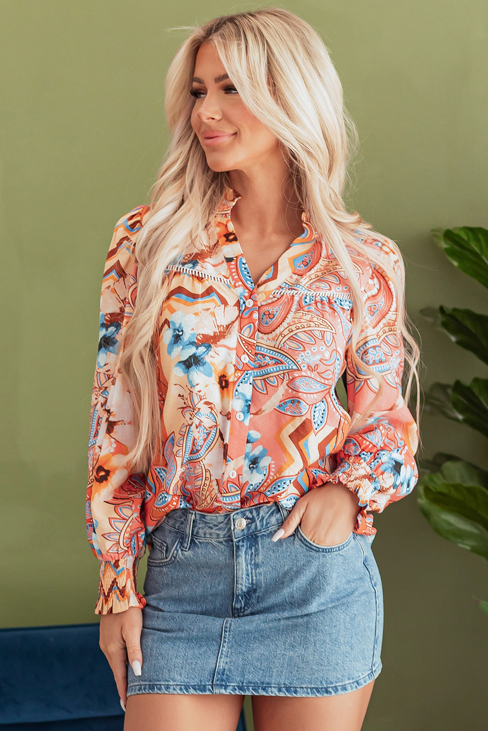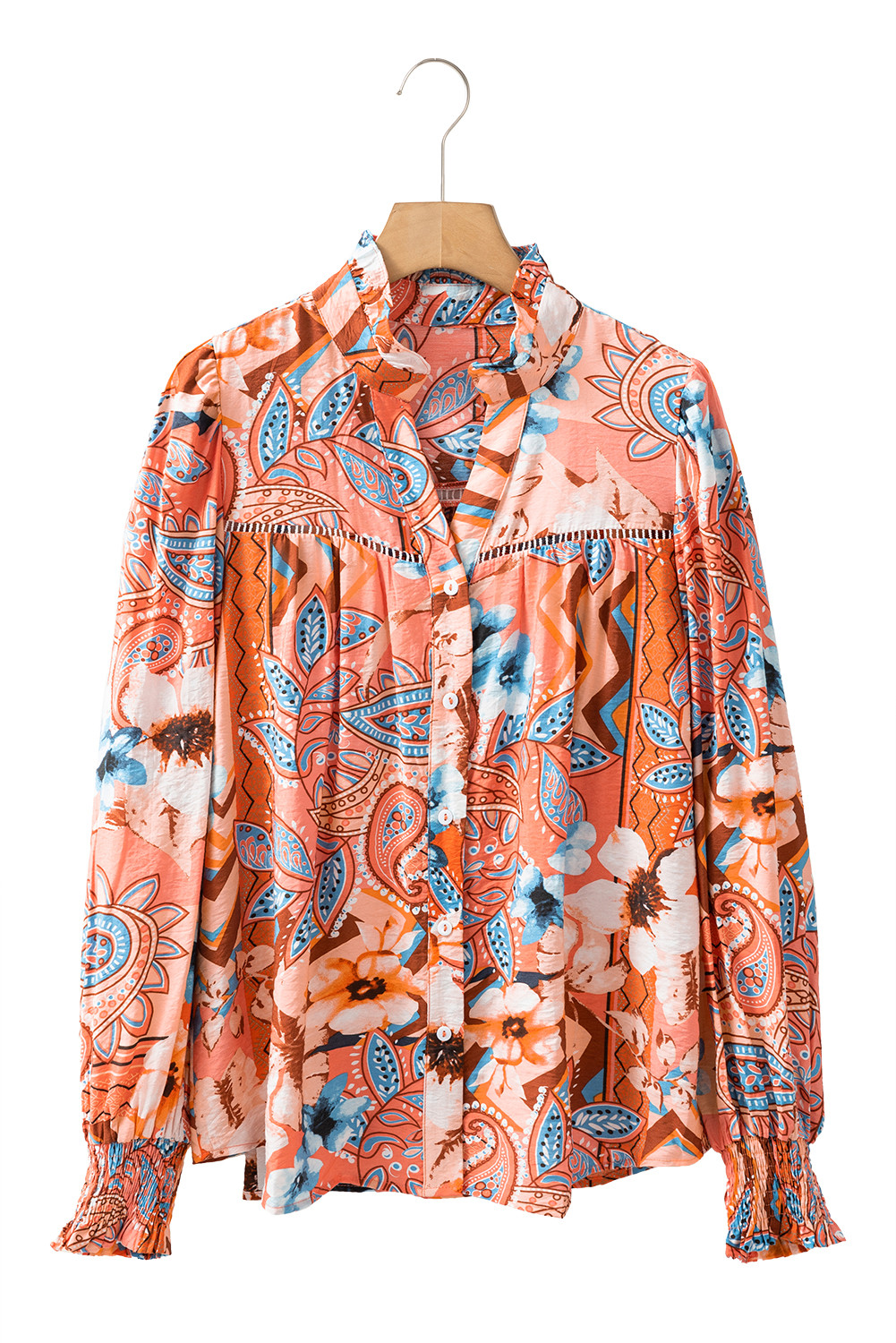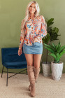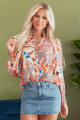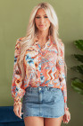 Orange Floral Print Shirred Cuff Buttoned Loose Shirt