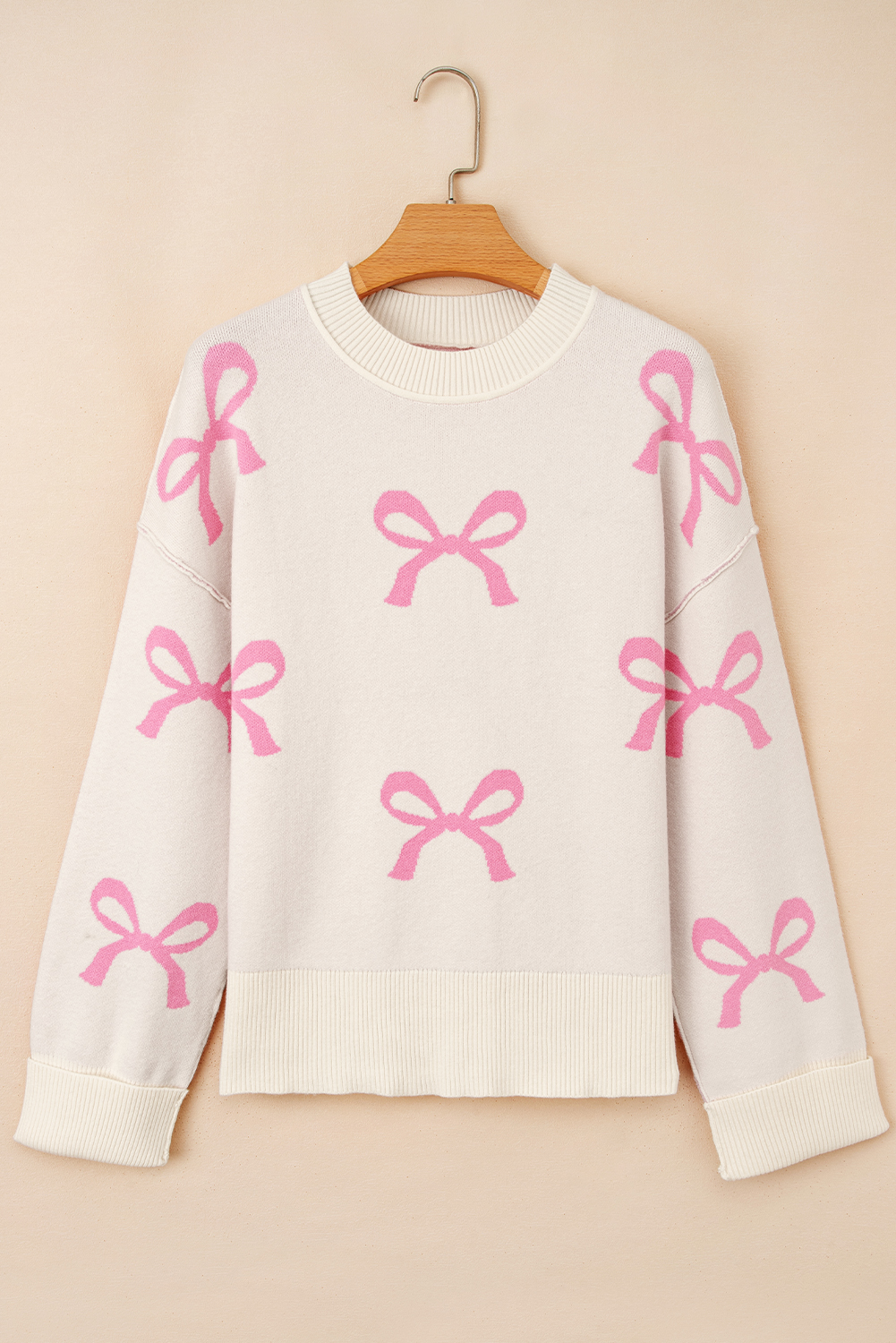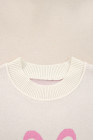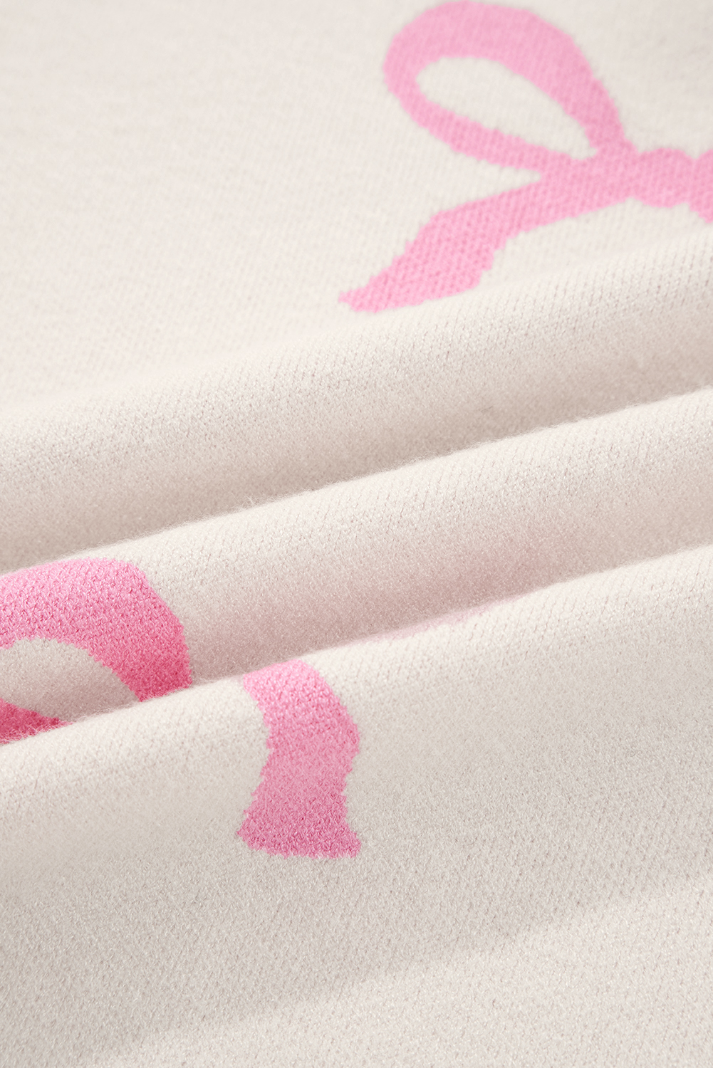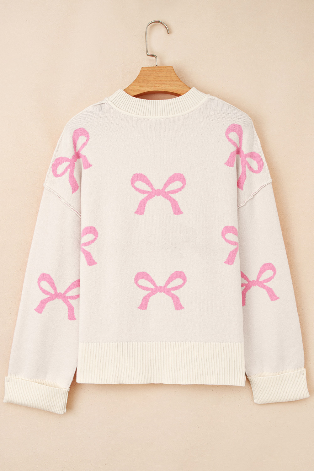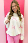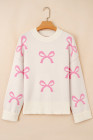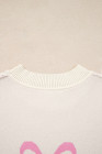 Pink Bow Print Ribbed Trim Exposed Seam Drop Shoulder Loose Sweater