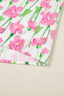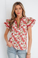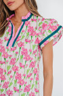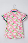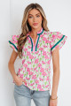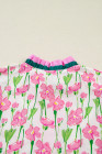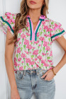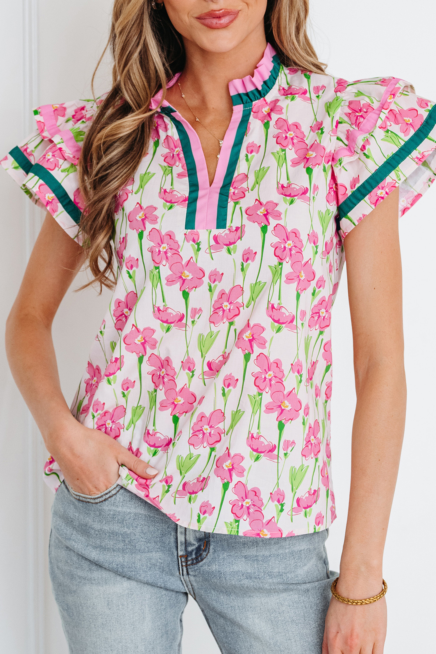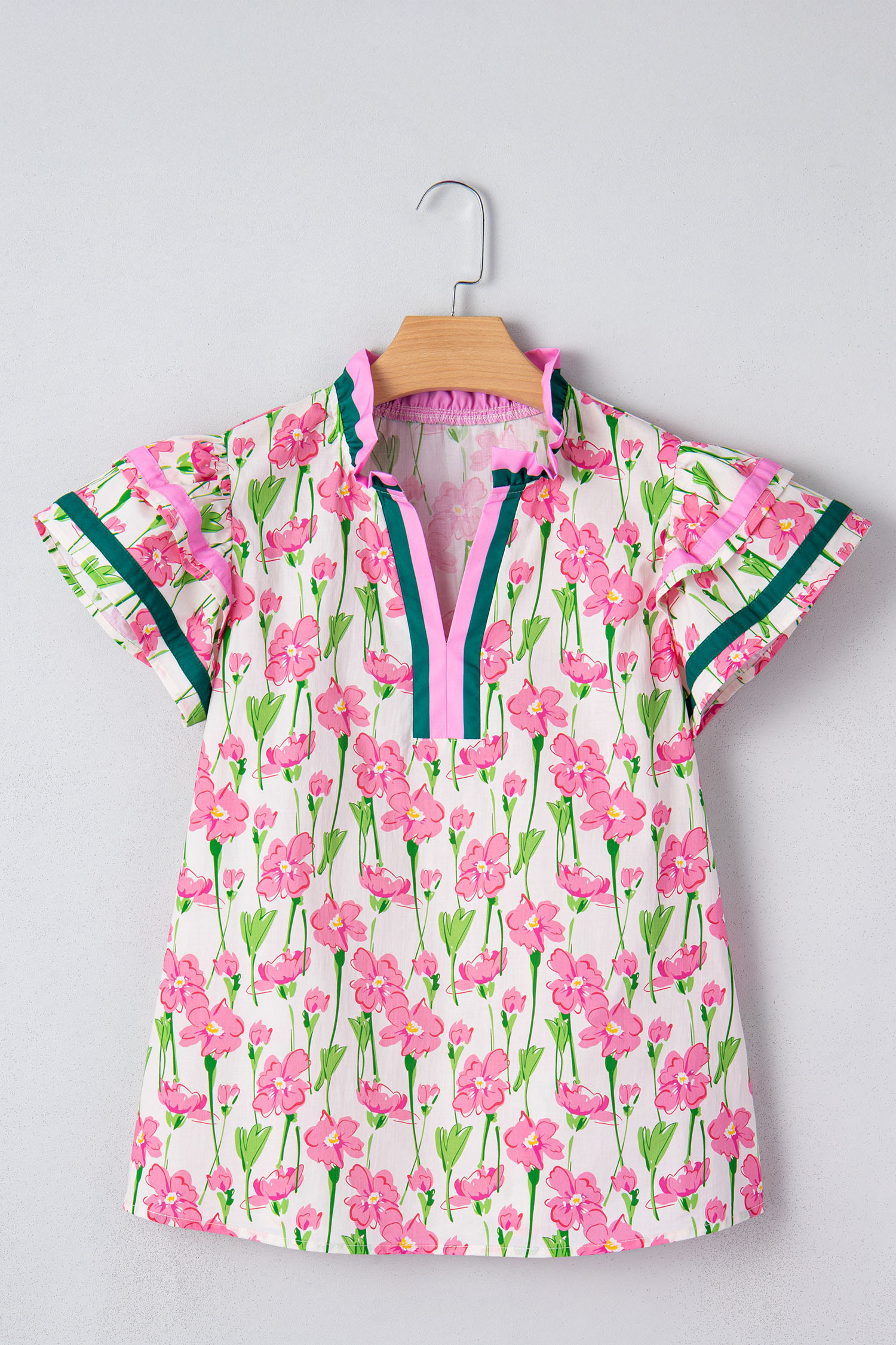 Pink Floral Print Contrast Trim V Neck Double Ruffled Short Sleeve Blouse