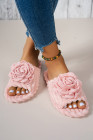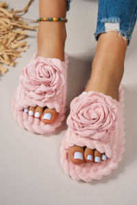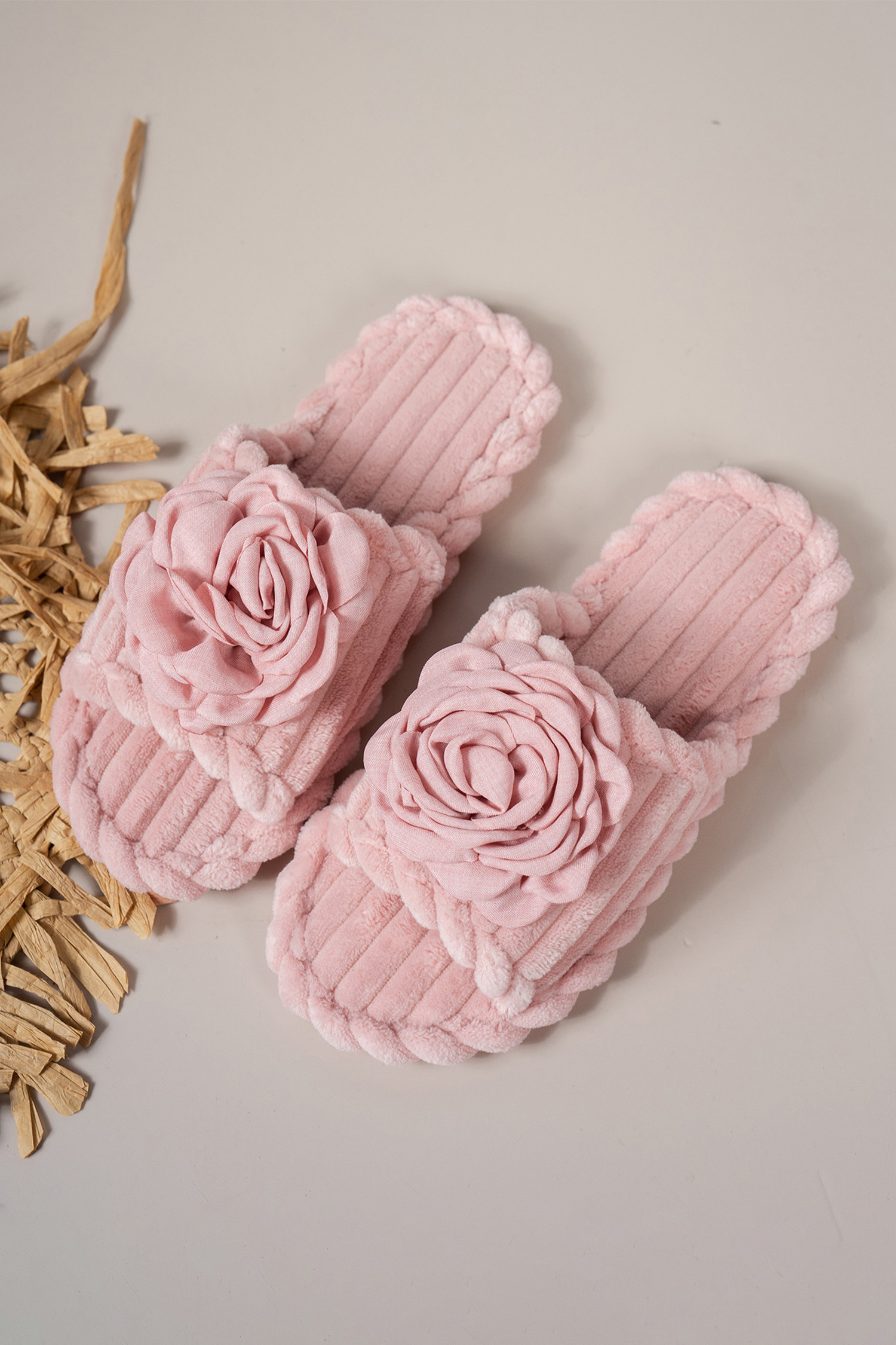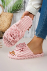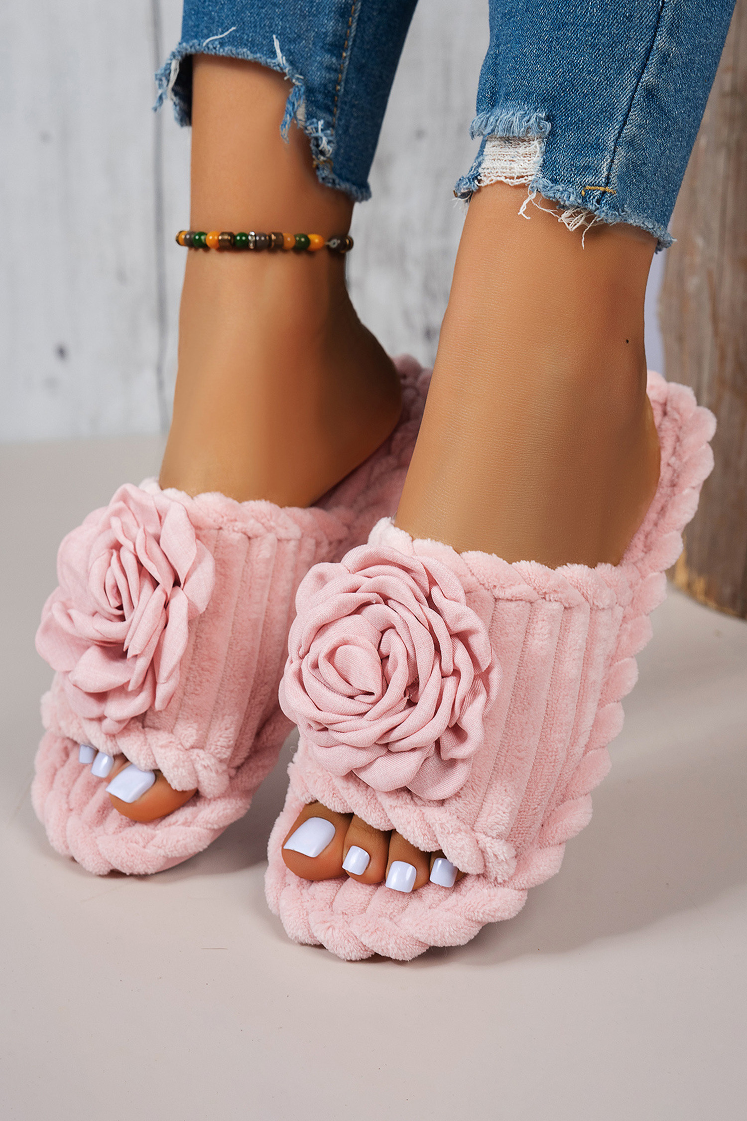 Pink Solid Color 3D Flower Accent Corded Ribbed Open Toe Slippers