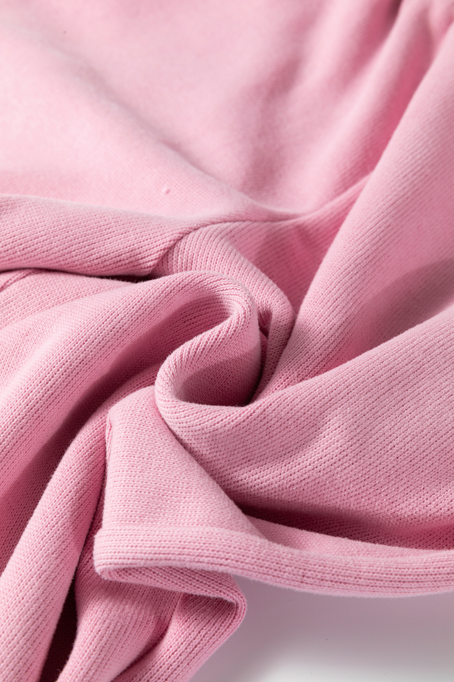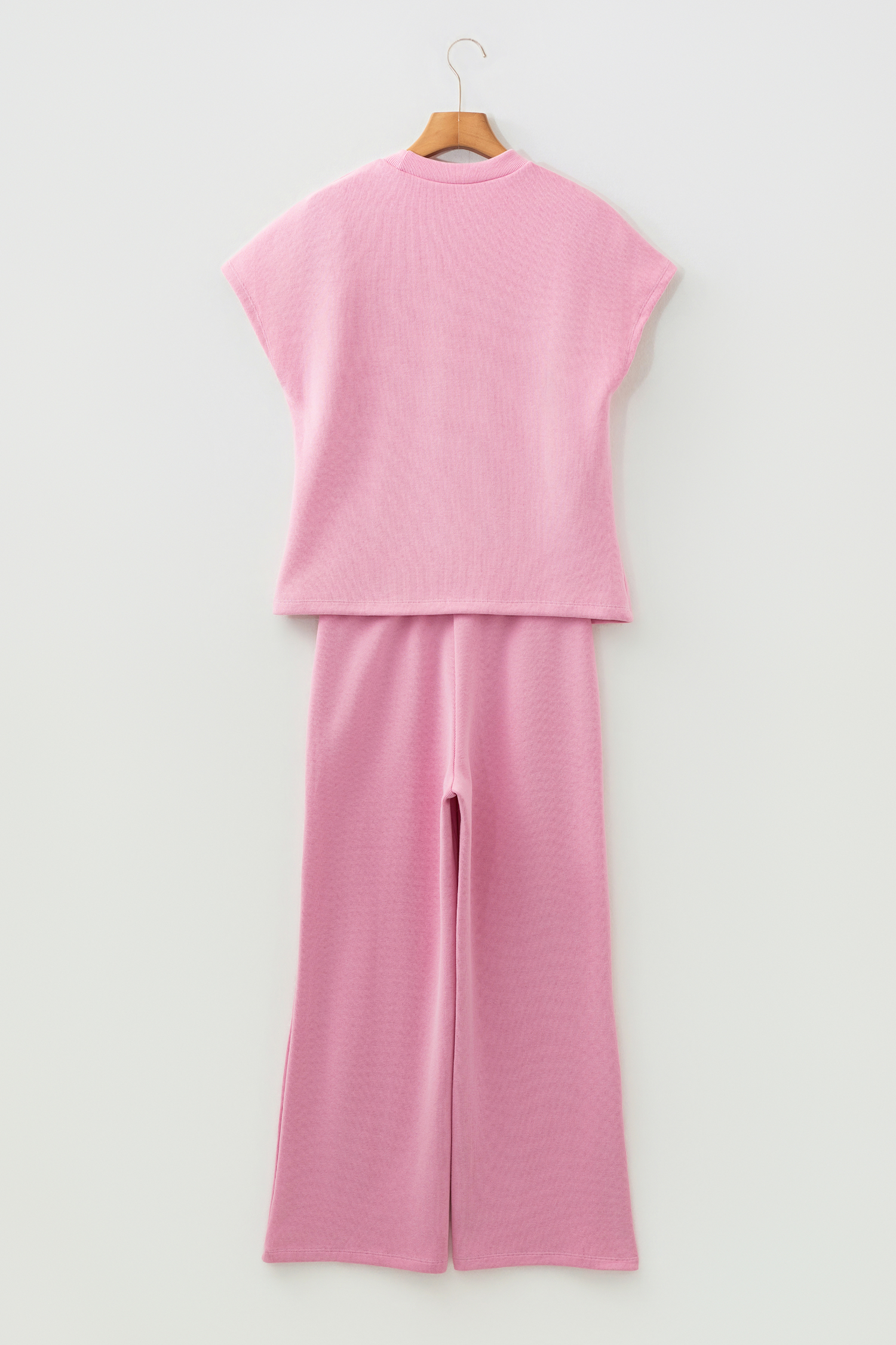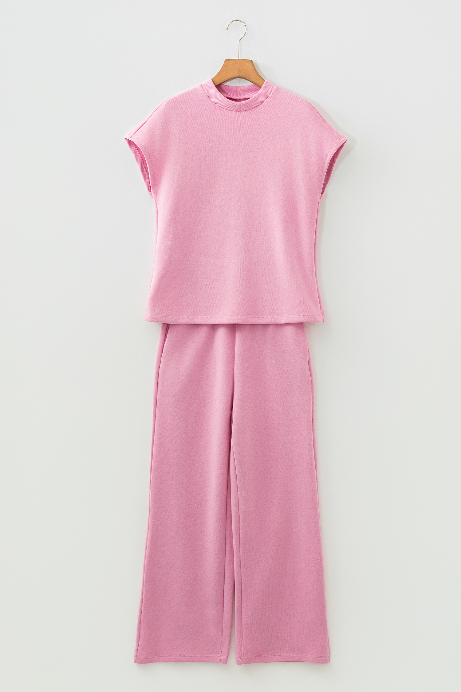 Pink Textured Knit High Neck Loose Tee Elastic Waist Loose Pant Set