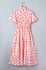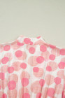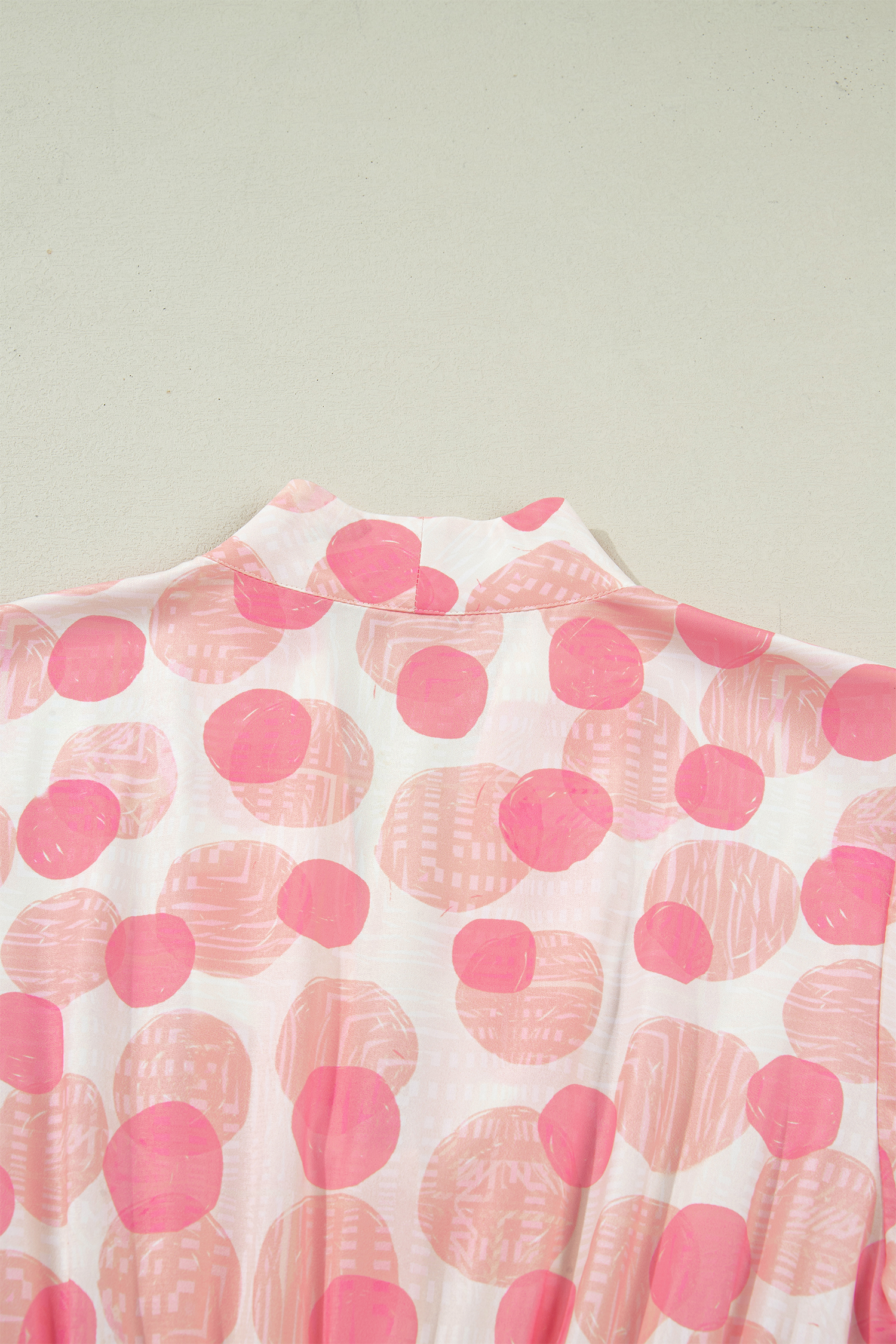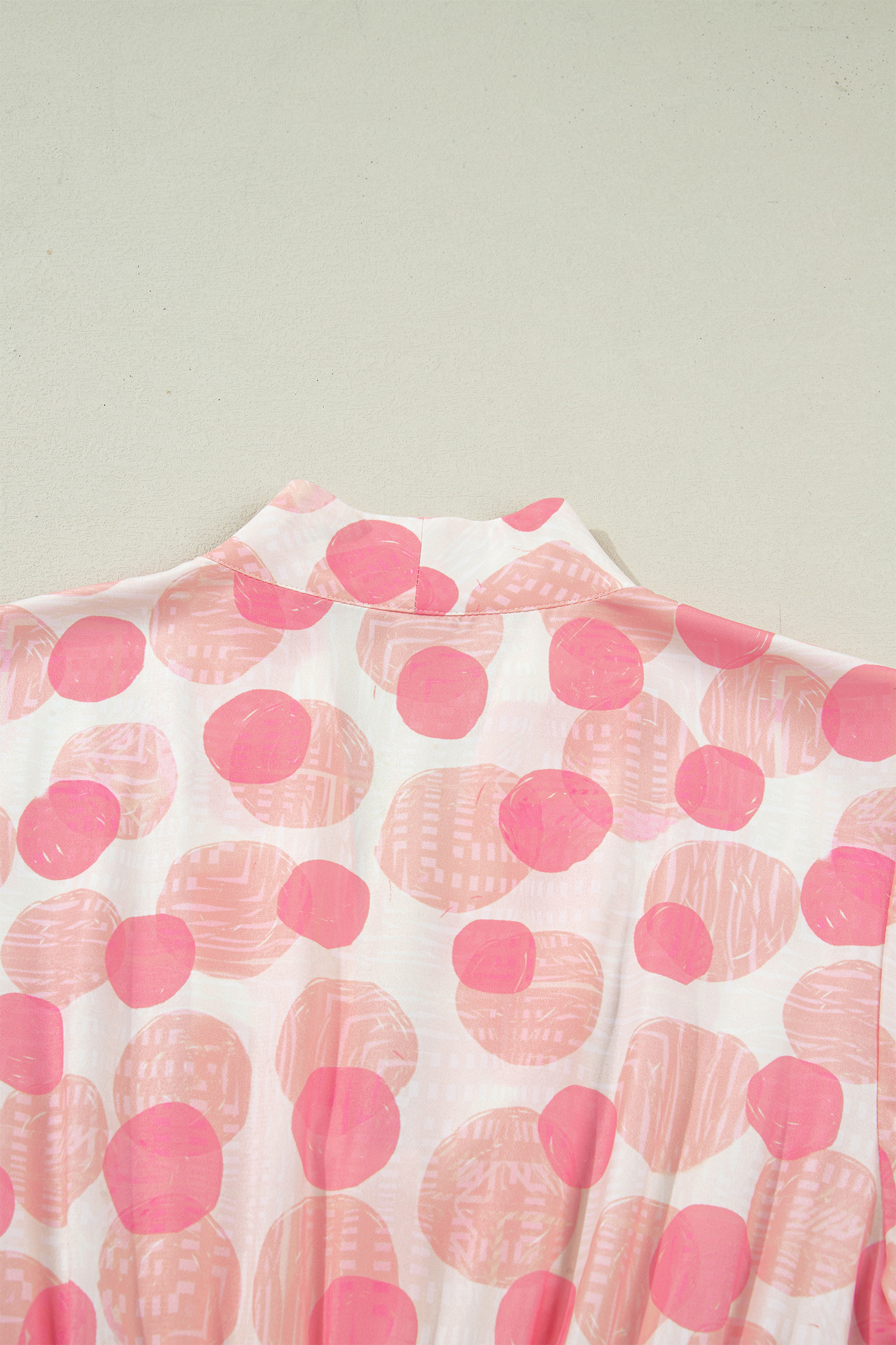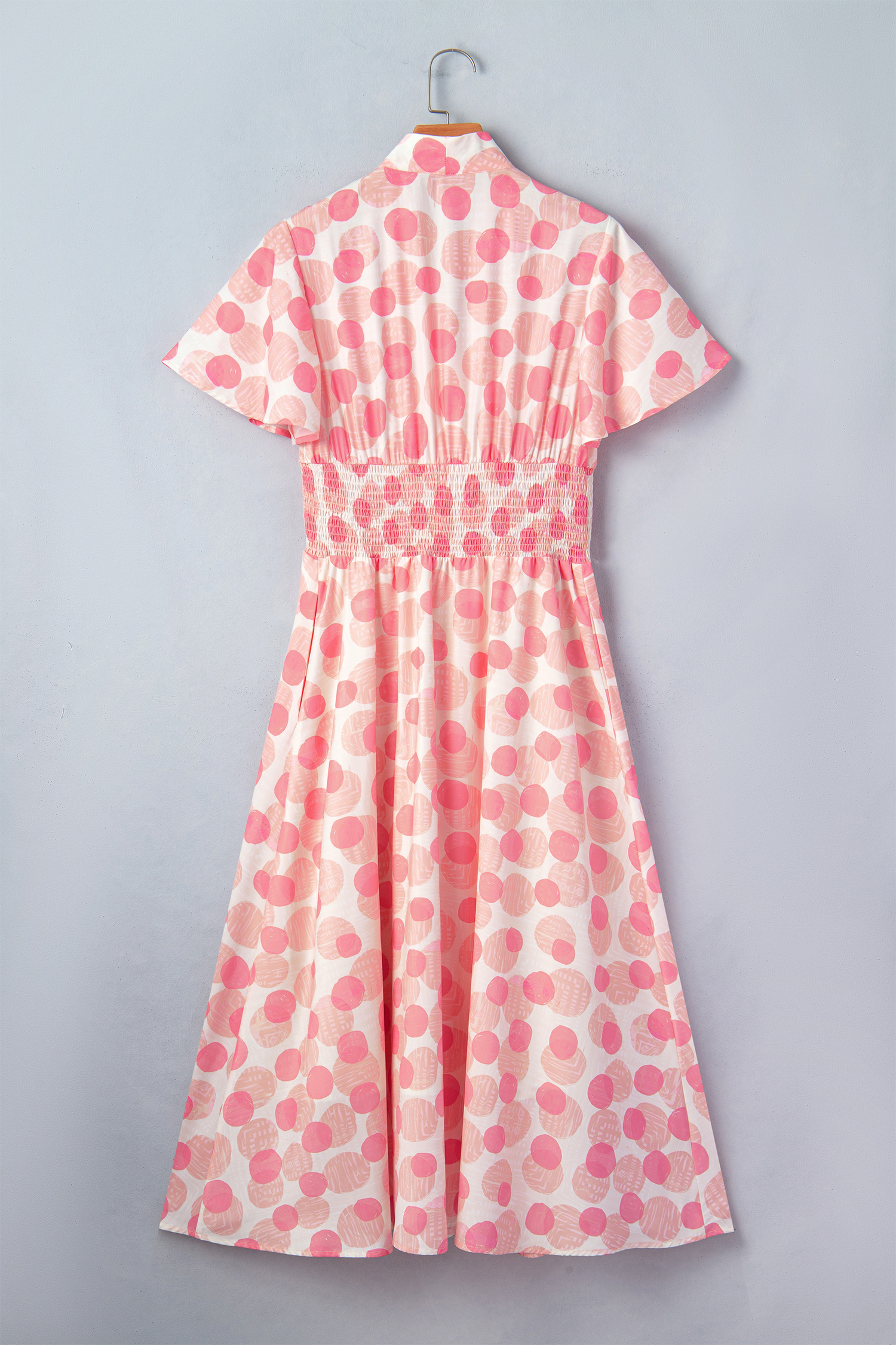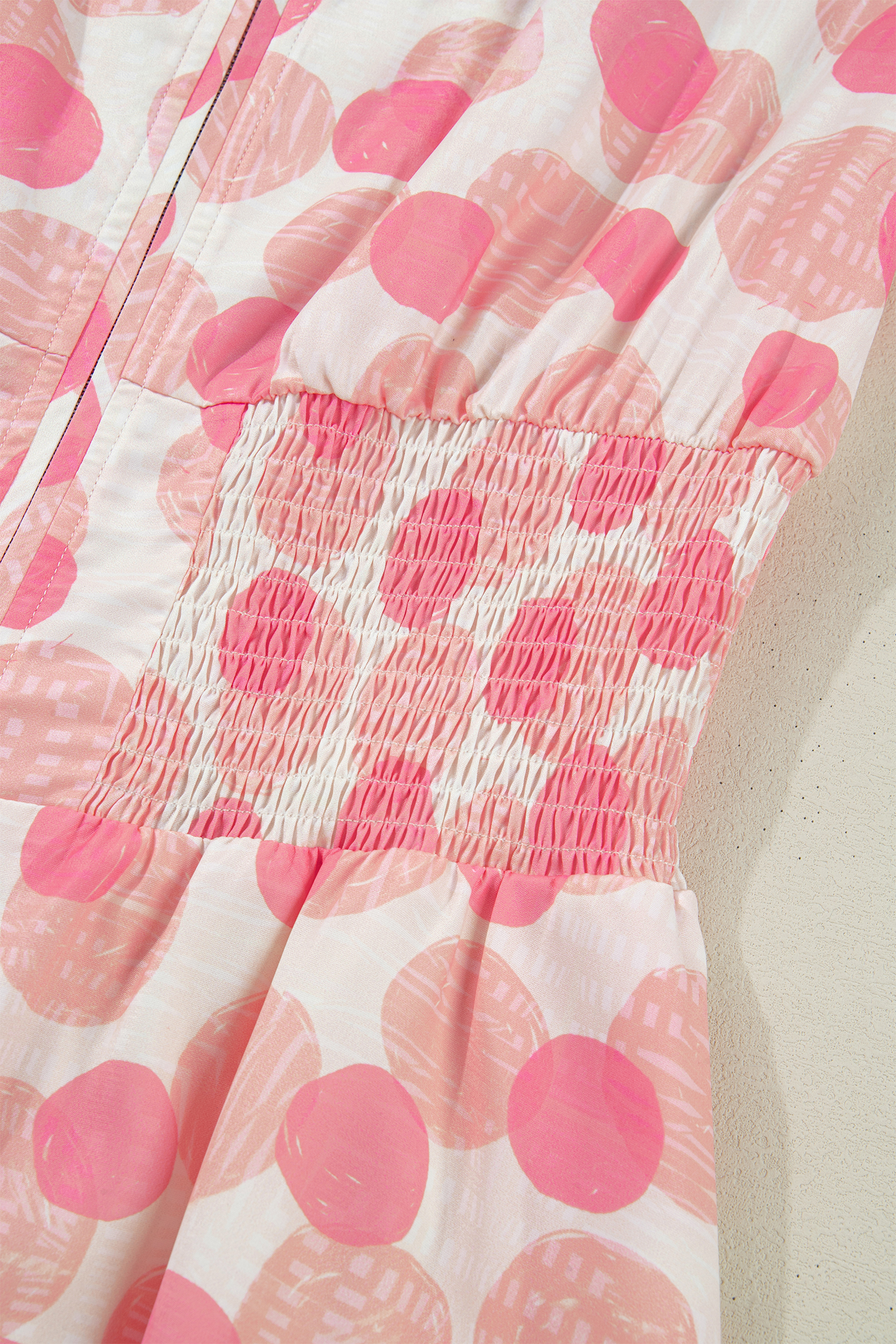 Pink Polka Dot Printed Ruffle Short Sleeve Zip Up Long Dress