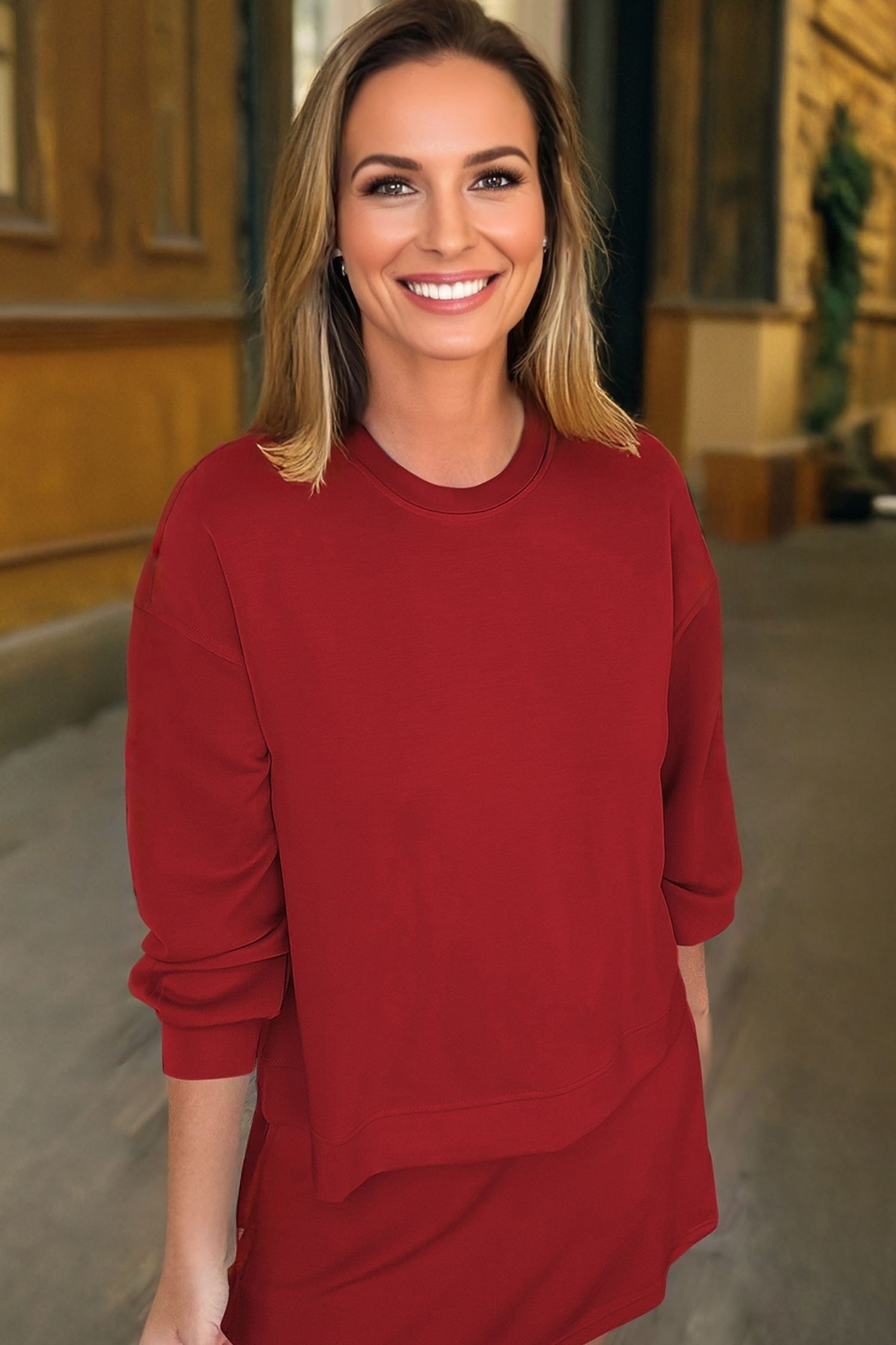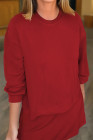 Racing Red Solid Color Drop Shoulder Pullover Drawstring Mini Skirt 2pcs Outfit