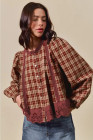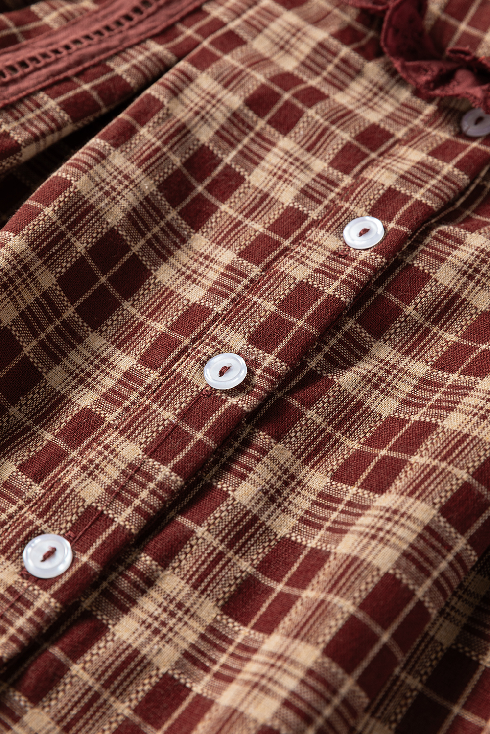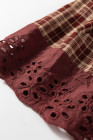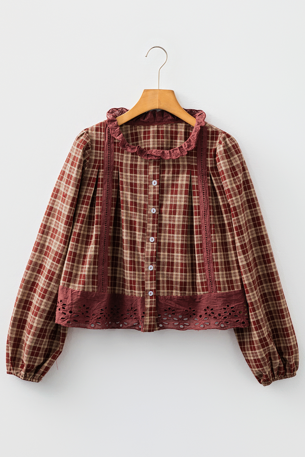 Red Dahlia Plaid Eyelet Lace Trim Button Down Loose Long Sleeve Shirt