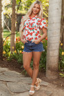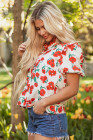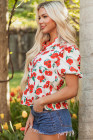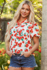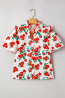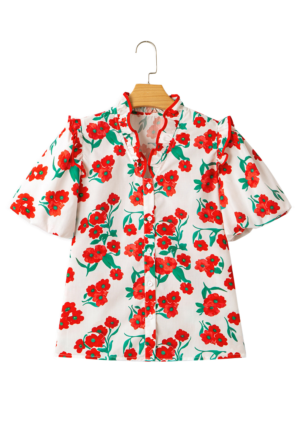 Red Floral Print Ruffled Puff Sleeve Elegant Summer Shirt