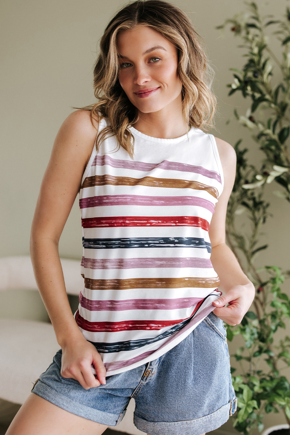 Red Stripe Rainbow Round Neck Tank Top