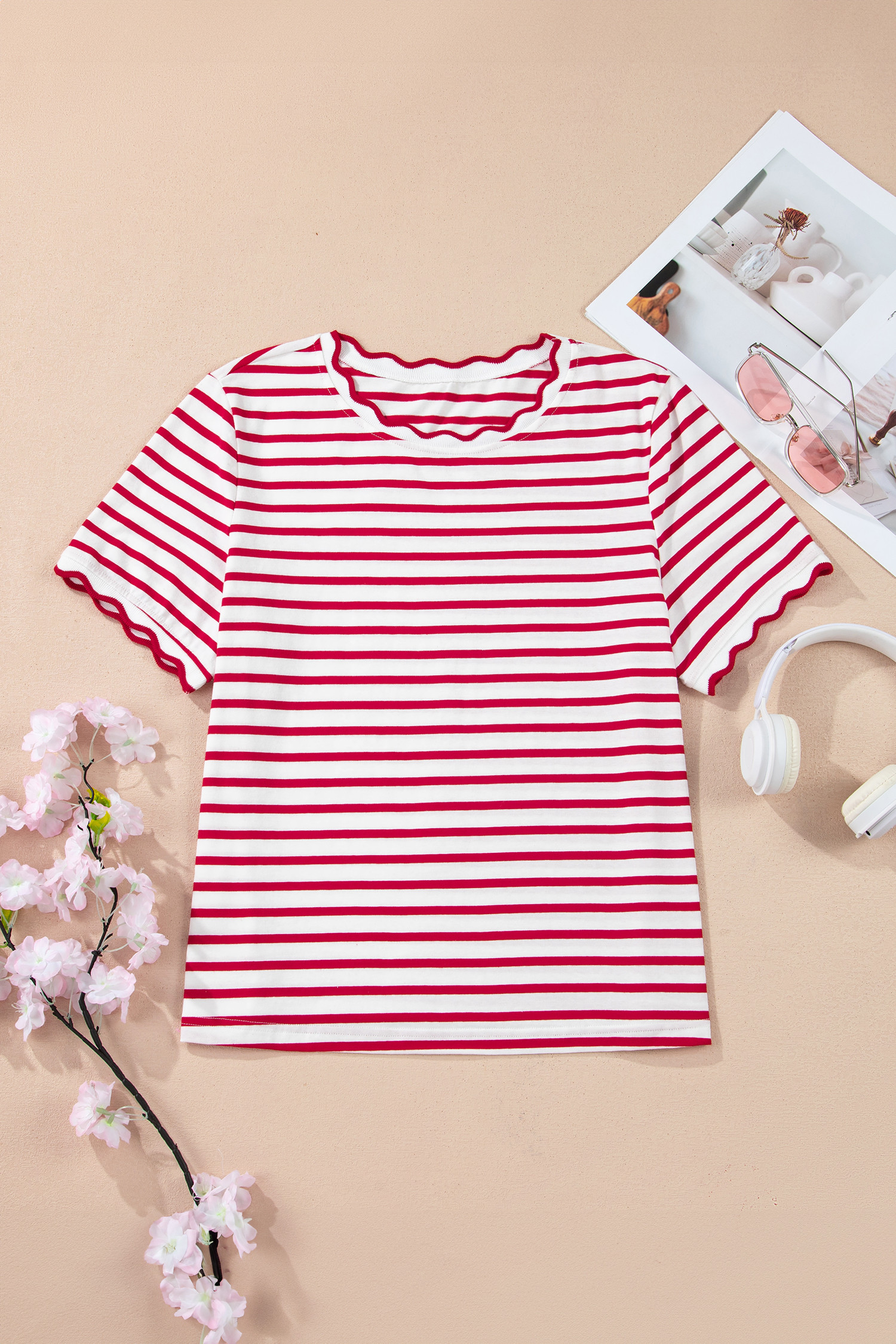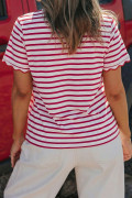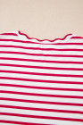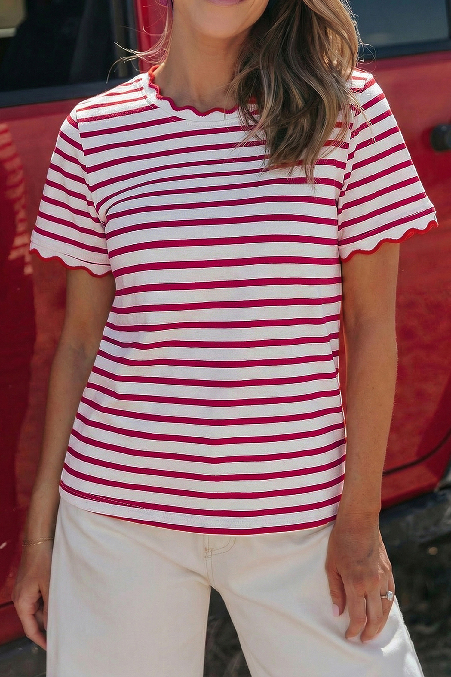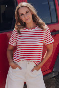 Red Stripe Scalloped Trim Round Neck T Shirt