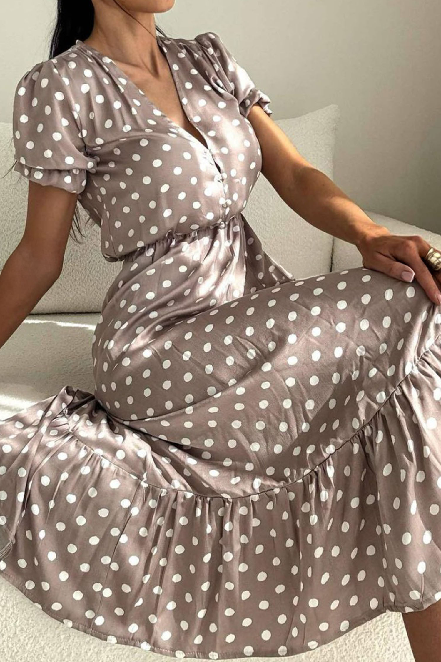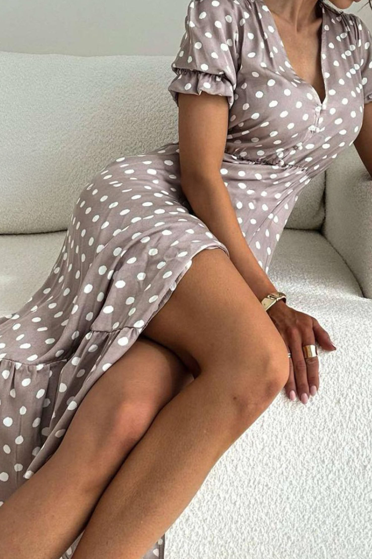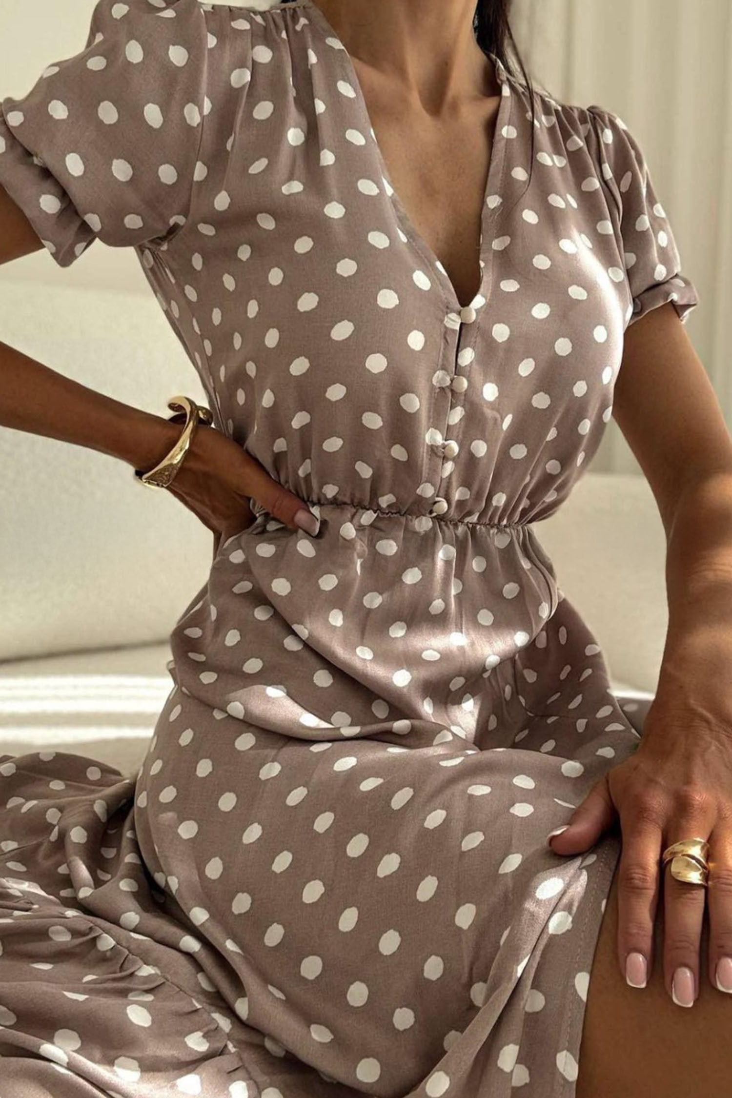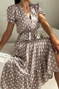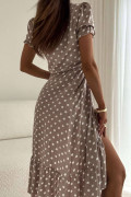 Simply Taupe Polka Dot Print Short Bubble Sleeve Side Slit Maxi Dress