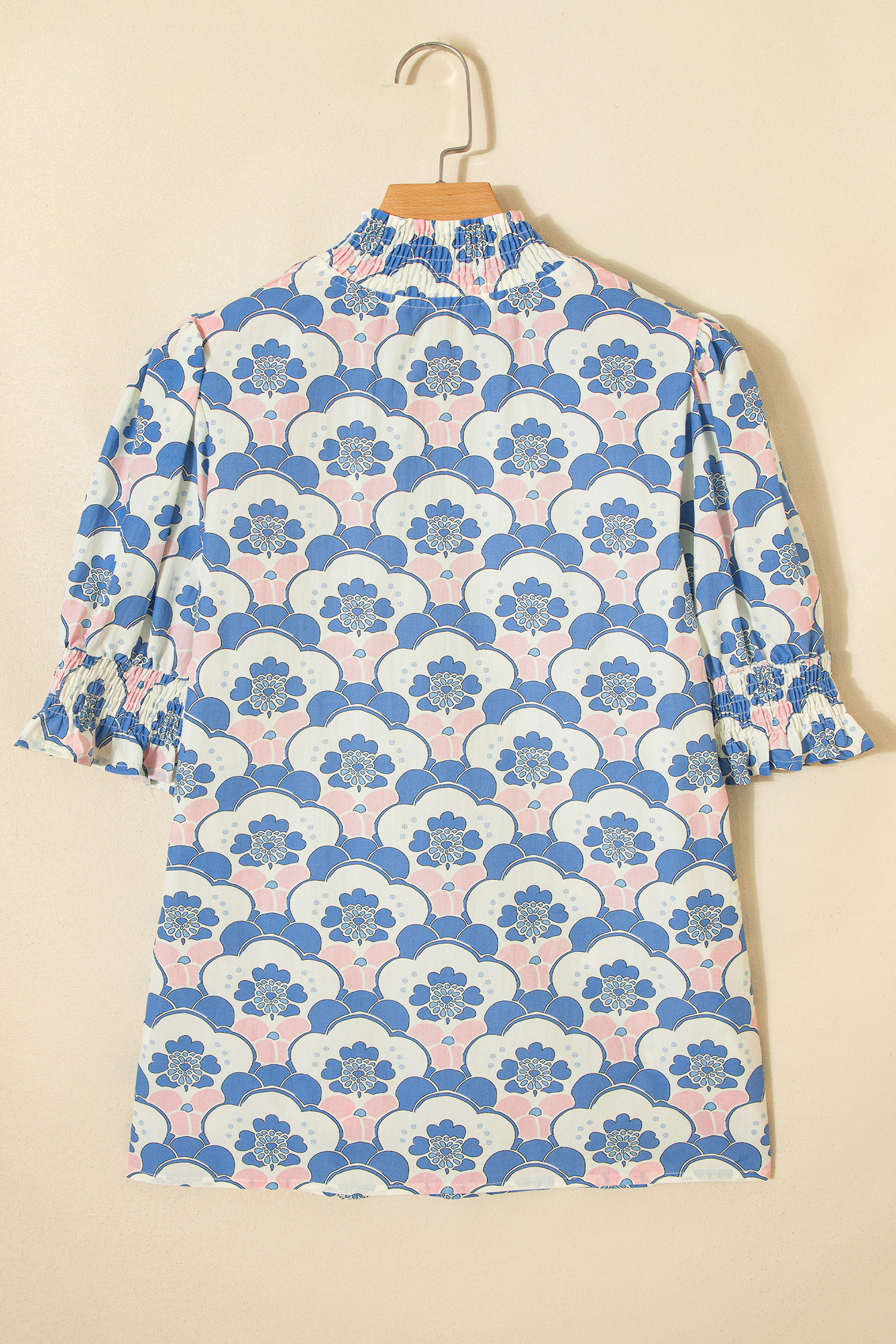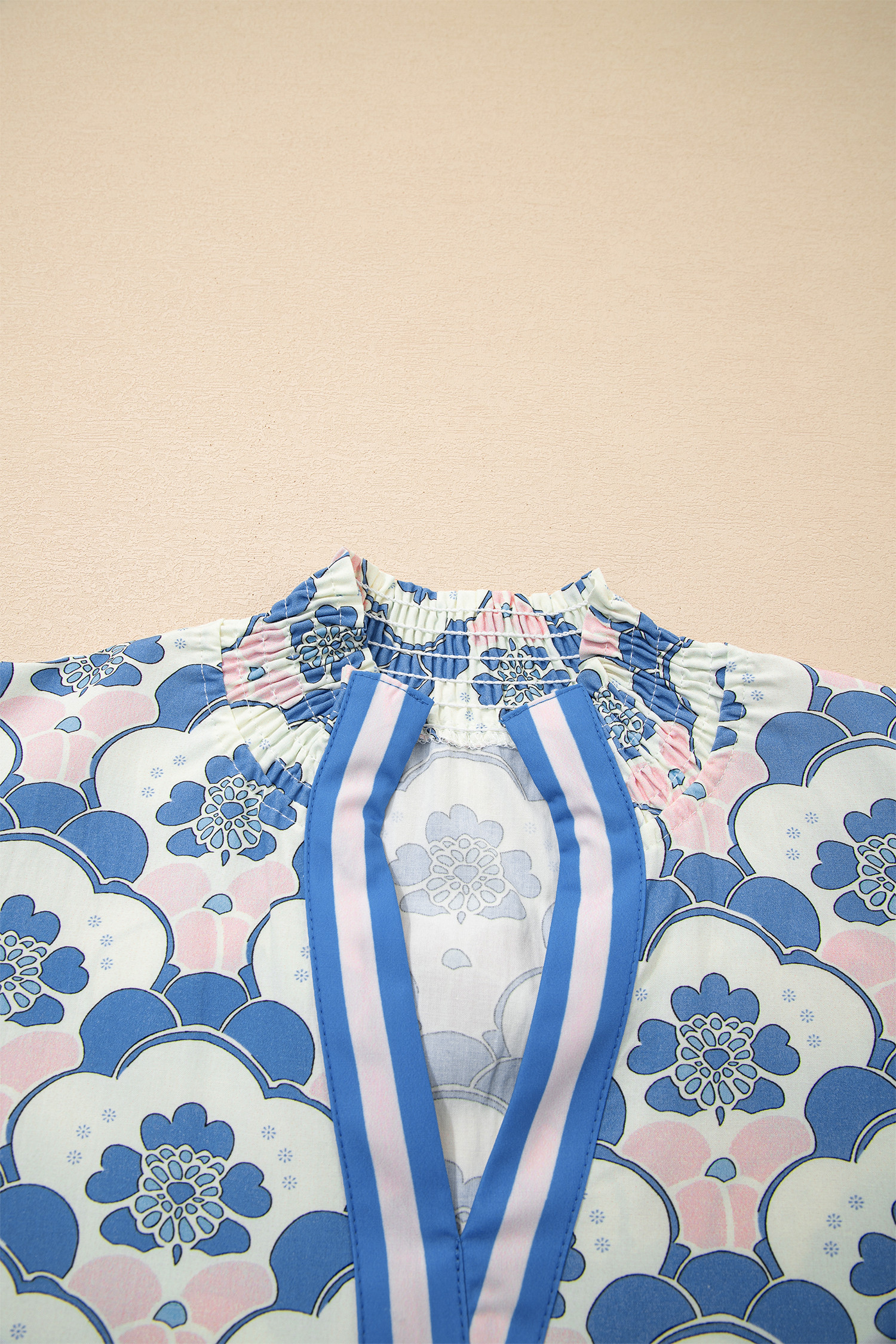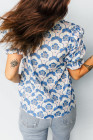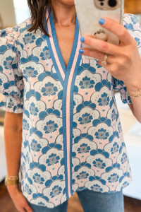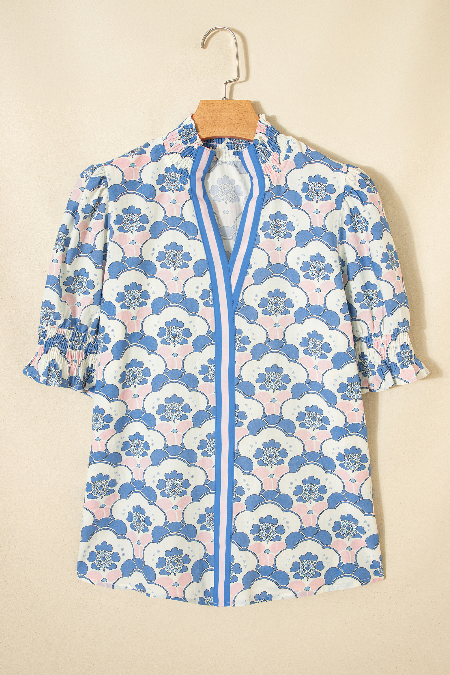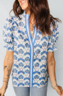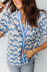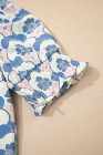 Sky Blue Floral Print Flounced Short Sleeve Contrast Trim V Neck Blouse